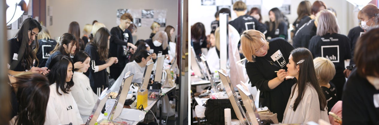 11月28日に行われた日本大会では、出場者32名のファイナリストのヘアアレンジとメイクをAshの美容師が担当しました。着物とイブニングドレス、それぞれの衣装に合わせてヘアとメイクの両方を手掛けます。衣装チェンジの合間の限られた時間で、舞台上で活躍する出場者の方々の魅力を最大限に引き出すようヘアメイクを施しました。仕上がりのクオリティはもちろんのこと、一人ひとりが自信を持ってステージに立てるよう美容技術を通じて精神面でもサポートできるように努めました。