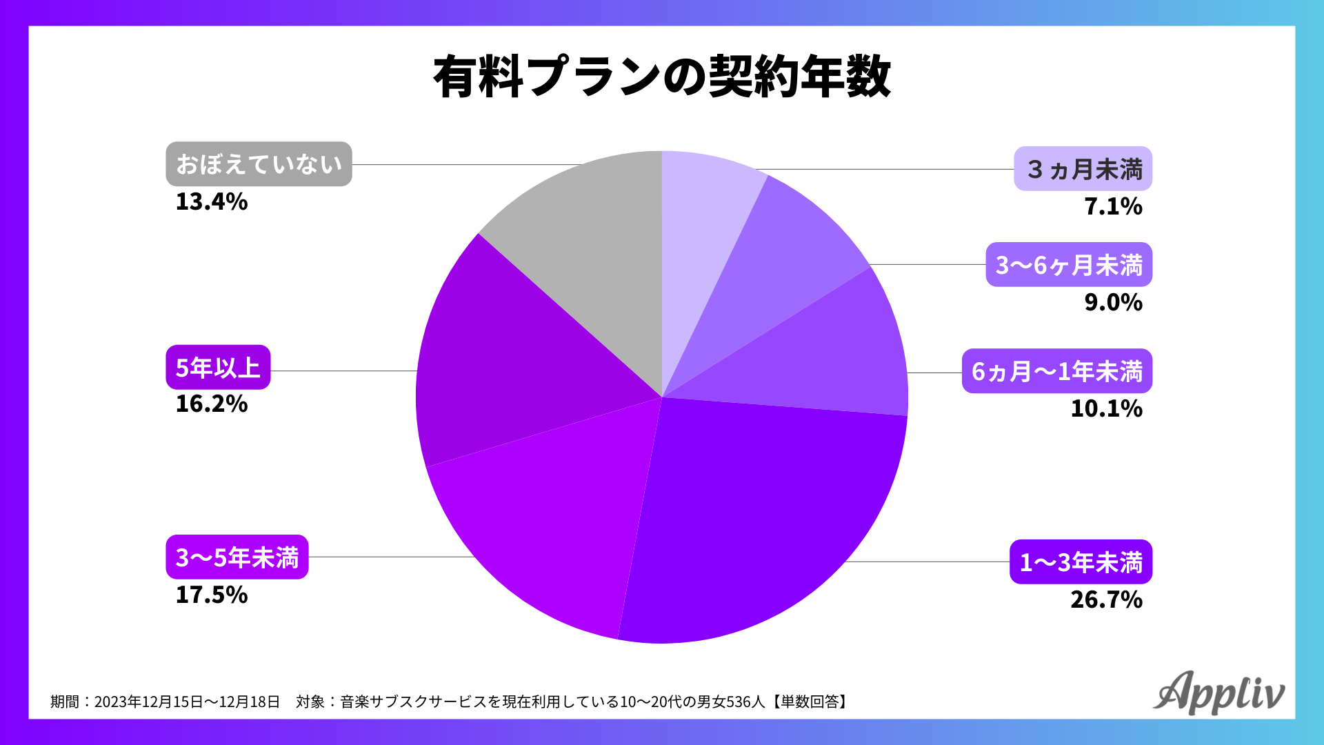 続いて、有料プランの契約年数について聞いてみると、最多は「1年~3年未満(26.7%)」、次いで「3年~5年未満(17.5%)」、「5年以上(16.2%)」でした。