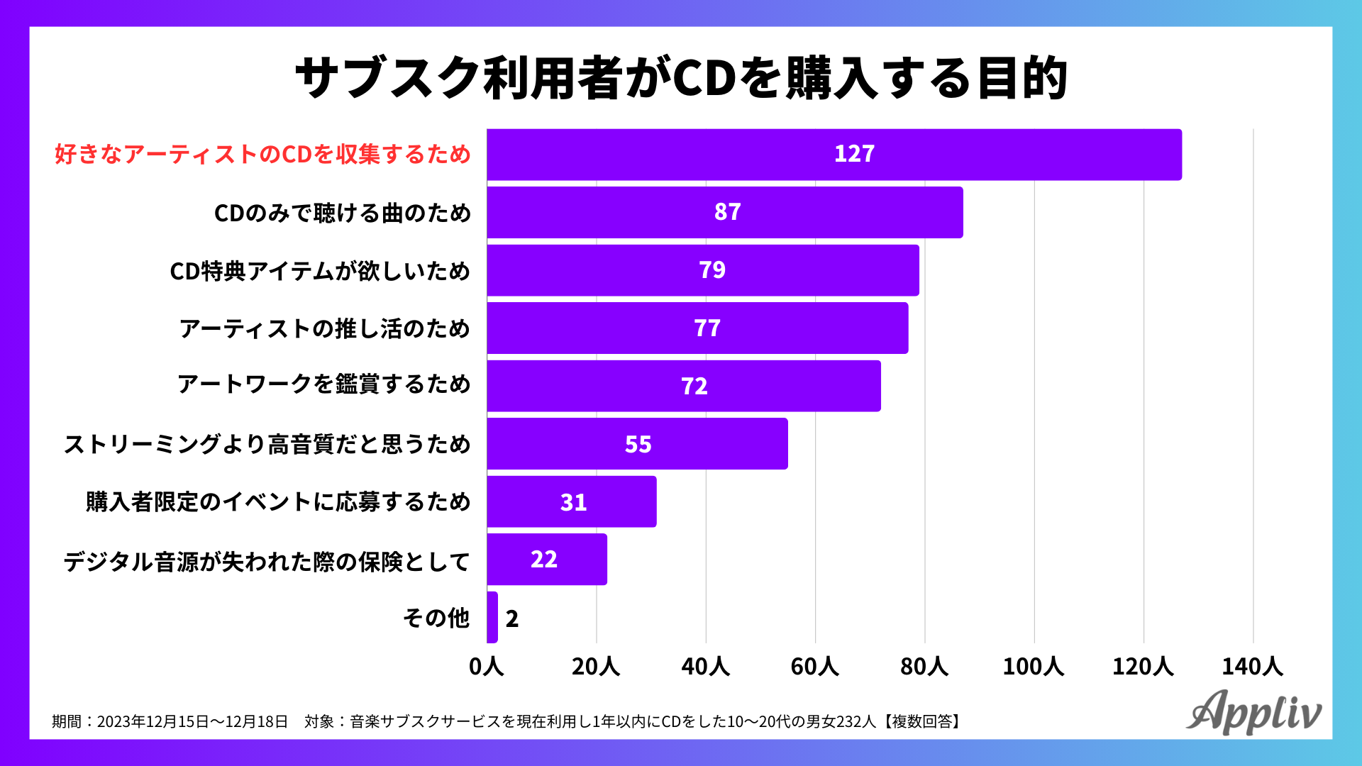 2023年にCDを購入したサブスク利用者232人に、CDを購入する目的を尋ねると、「好きなアーティストのCDを収集するため(127人)」が最も多く、次いで「CDのみで聴ける曲のため(87人)」、「CDの特典アイテムが欲しいため(79人)」という結果でした。