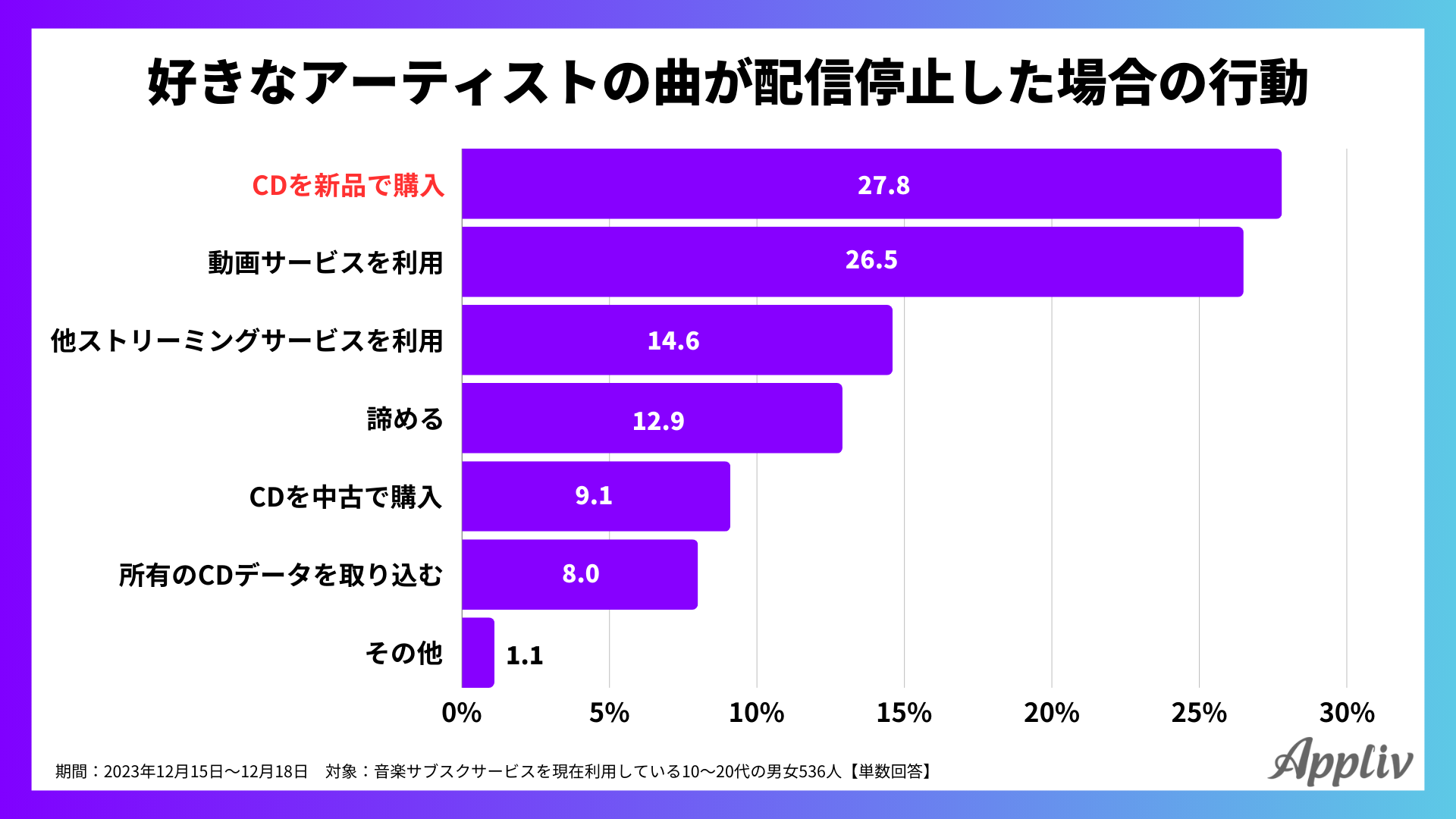 好きなアーティストの楽曲が、利用中のストリーミングサービスで配信停止となった場合どうするかを尋ねてみると、1位は「CDを新品で購入する(27.8%)」でした。
