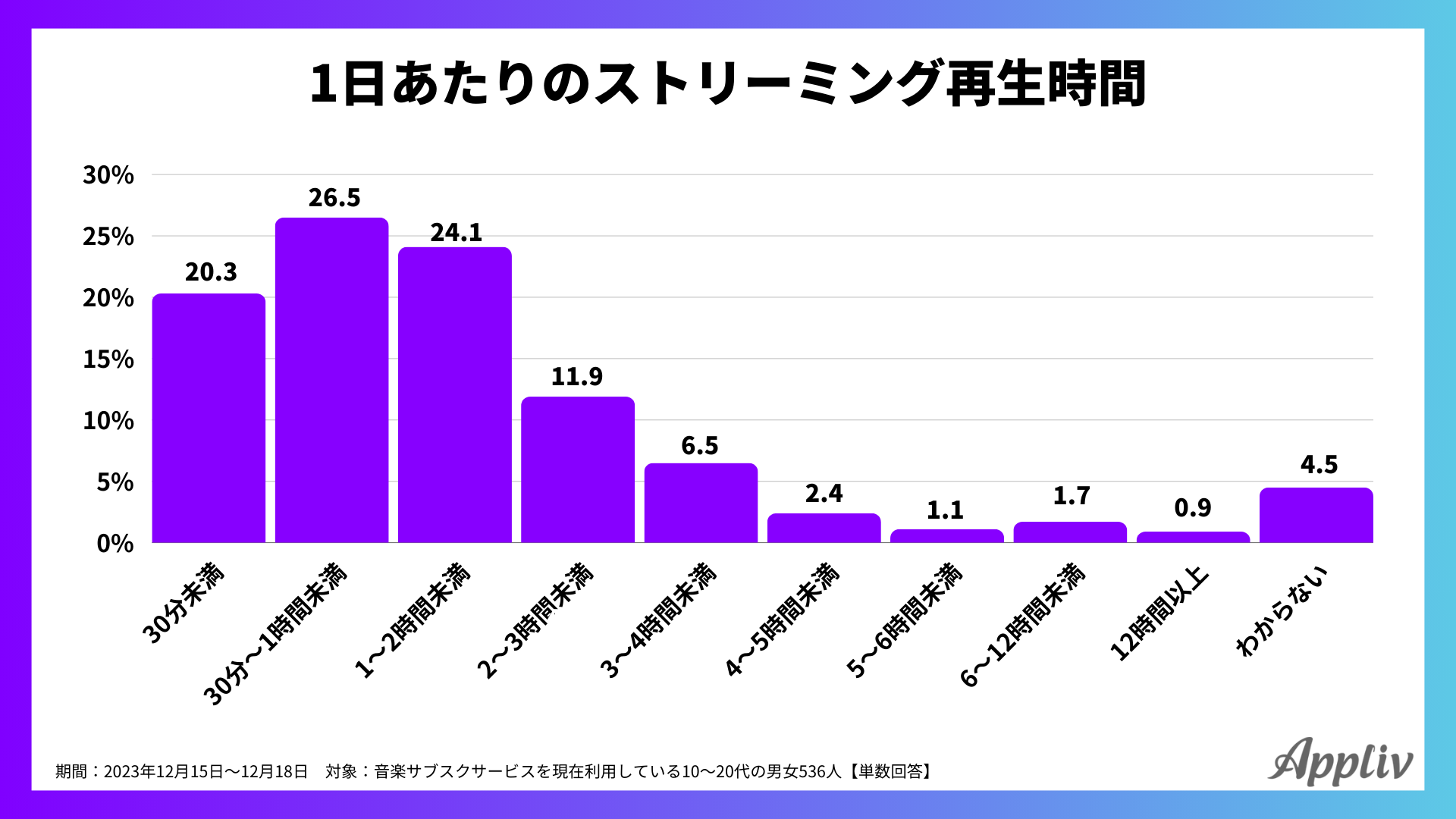 ストリーミングサービスで1日あたりに音楽を聴く時間を調査すると、最多は「30分~1時間未満」で26.5%、全体の70.9%が「2時間未満」と回答しています。