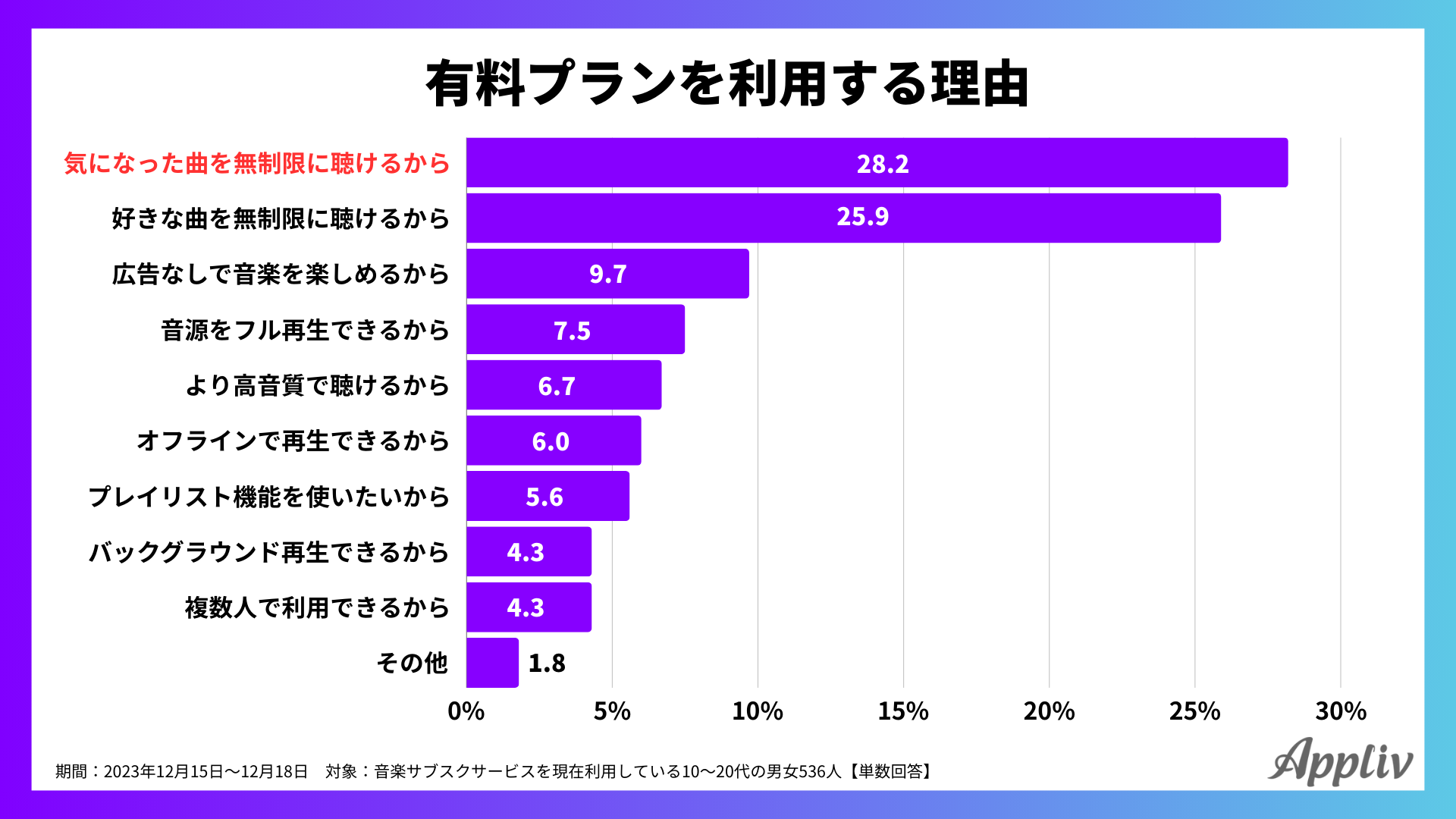 有料プランを利用している理由について尋ねると、TOP3は「気になる曲を無制限に聴くことができるから(28.2%)」、「好きな曲を無制限に聴くことができるから(25.9%)」、「広告なしで音楽を楽しめるから(9.7%)」でした。