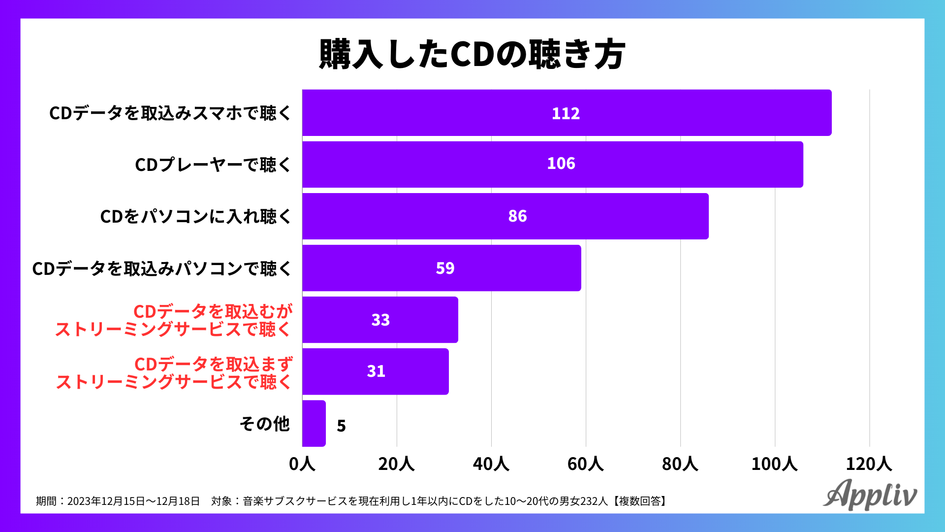 購入したCDの聴き方について調査すると、最多は「CDのデータを取り込んで、スマホで聴く」で112人、2番目は「CDプレイヤーで聴く(106人)」、「パソコンで聴く(86人)」でした。
