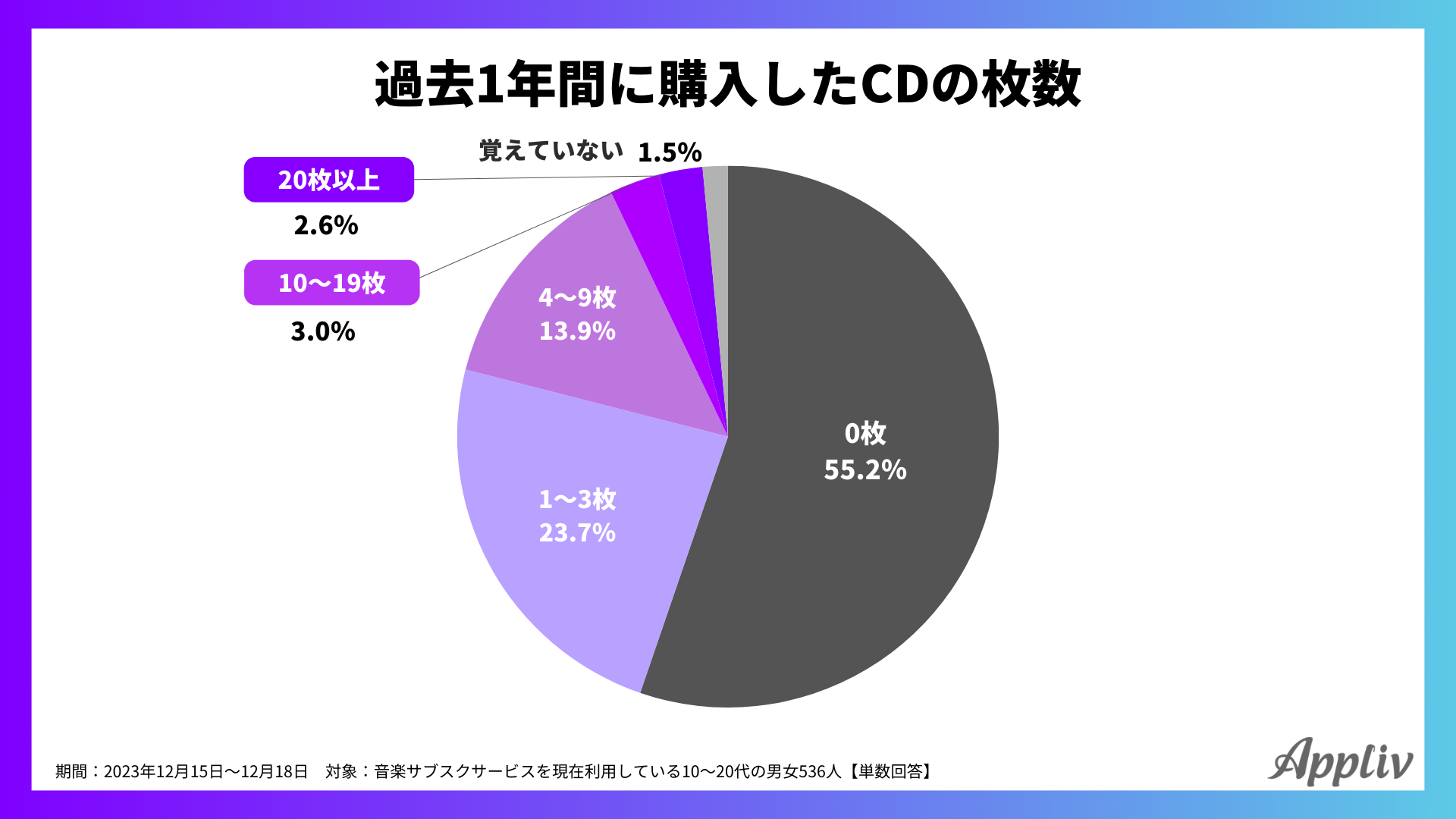 音楽サブスクサービスを現在利用している男女536人を対象に、2023年の1年間で購入したCDの枚数を調査した結果、「0枚」が55.2%、次いで「1~3枚(23.7%)」、「4~9枚(13.9%)」でした。