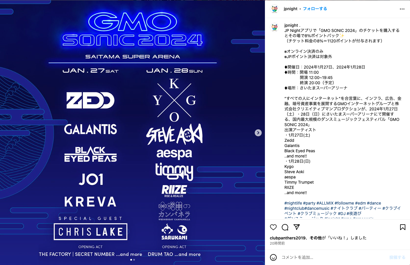 世界中の大人気アーティストが集まる「GMO SONIC 2024 さいたまスーパーアリーナ」の開催決定!最強の夜遊びアプリ、JP Nightでチケットを購入すれば1,120円分のポイントバック
