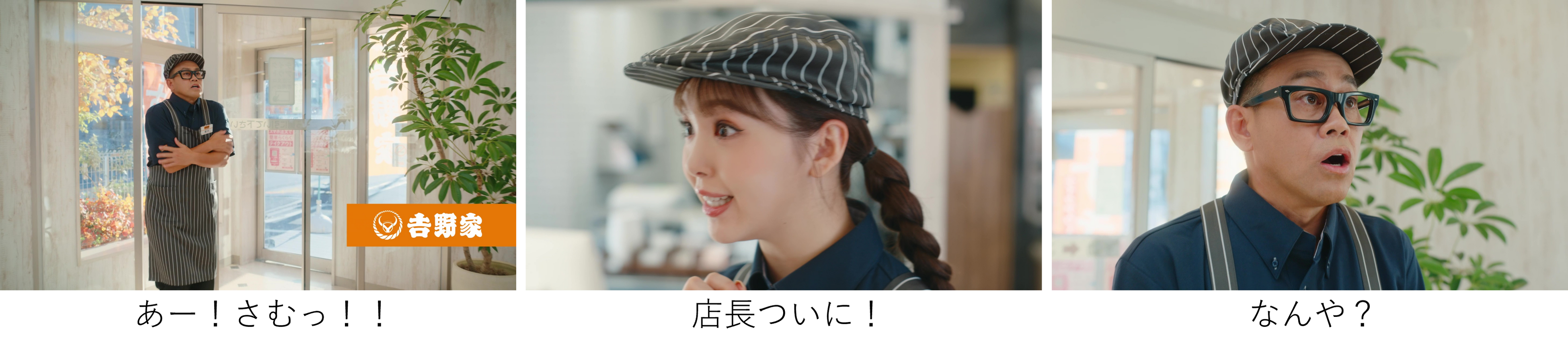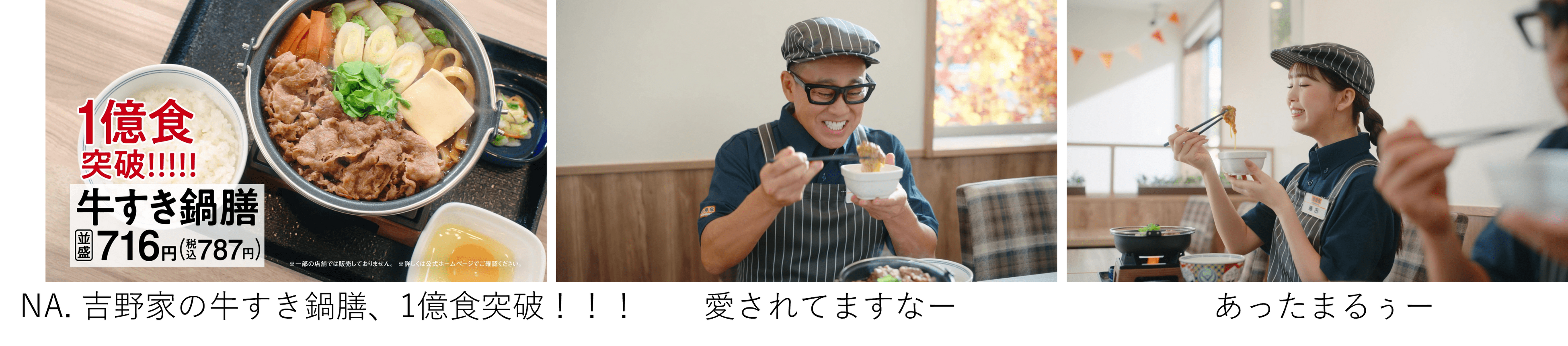 2023年11月2日から全国で放映したTV CM『牛すき鍋膳10周年』篇に続き、『牛すき鍋膳1億食』篇でも店長役を宮川大輔さん、アルバイト役を藤田ニコルさんが務めます。『牛すき鍋膳10周年』篇では店長に塩対応していた藤田さんでしたが、その後関係性を築き、『牛すき鍋膳1億食』篇では打って変わって優しくなる様子に注目ください。
