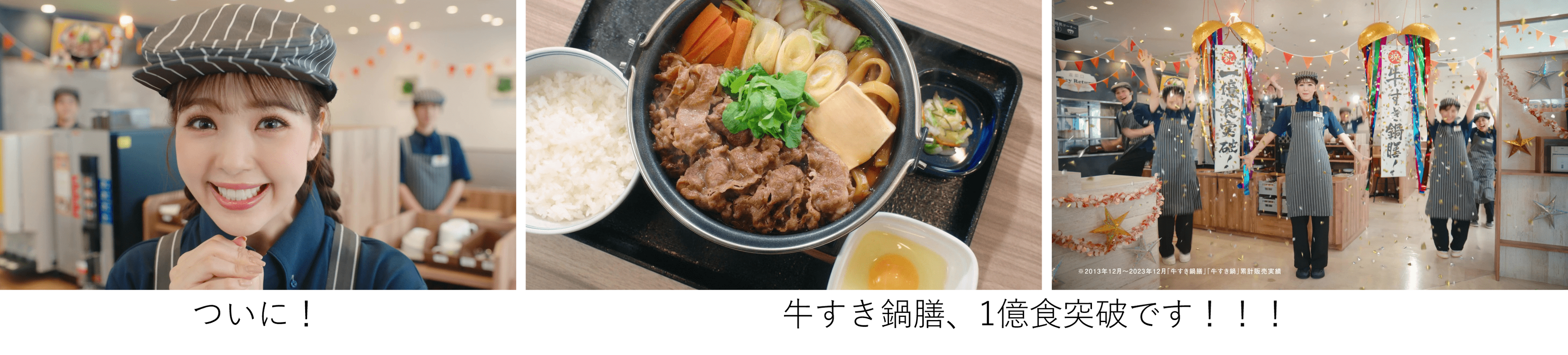 株式会社吉野家(本社:東京都中央区、代表取締役社長:河村泰貴、以下吉野家)は、2023年11月に全国の吉野家店舗※1で販売している「牛すき鍋膳」の累計販売数※2が1億食を突破しました。これまでのご愛顧に感謝し、1月12日から「牛すき鍋膳並盛」を「牛すき鍋膳大盛」に無料でサイズアップして提供する『牛すき(並盛)肉増量祭』を開催します。また、1月5日からは宮川大輔さんと藤田ニコルさんが出演する新TV CM『牛すき鍋膳1億食』篇を全国で放映します。
