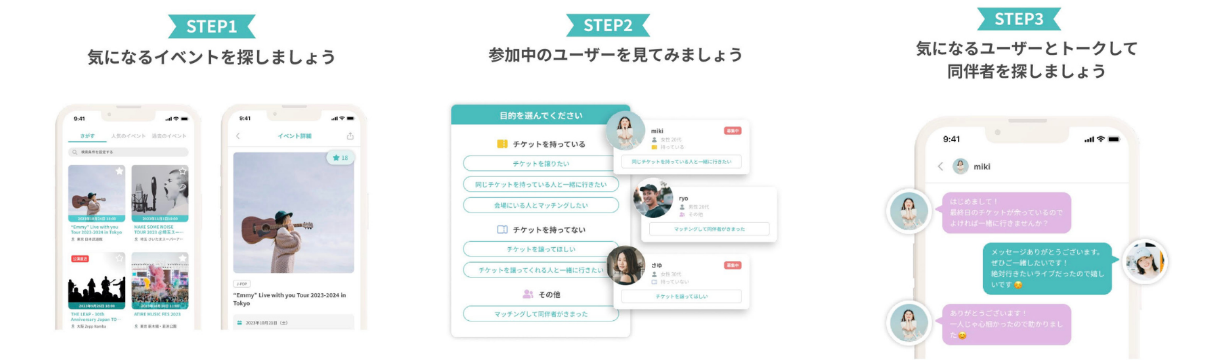 Atireは音楽イベント同行者を見つけるための専門マッチングアプリです。抽選に外れたけど、どうしても行きたいライブは誰しもあるはず。そんな時、Atireでは「チケットは複数枚持っているが同行者がまだ見つかっていない」「一緒に行くはずだった人が急遽来られなくなってしまった」など、同行者を求めている方とマッチングできます。