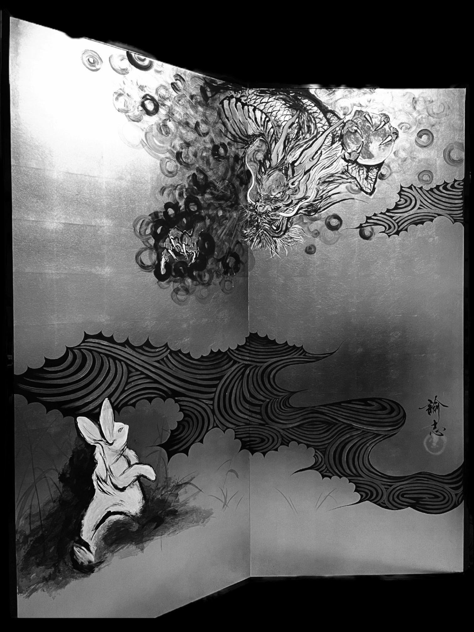 書画アーティストとして墨と紙の白黒世界で長く修行をして来ました。近年は箔やアクリル等を使い鮮かな作品が多いですが、それは近年の書家達にも多く見られ、原点に戻り白黒だけの世界に溺れて見たい、それが始まりでした。