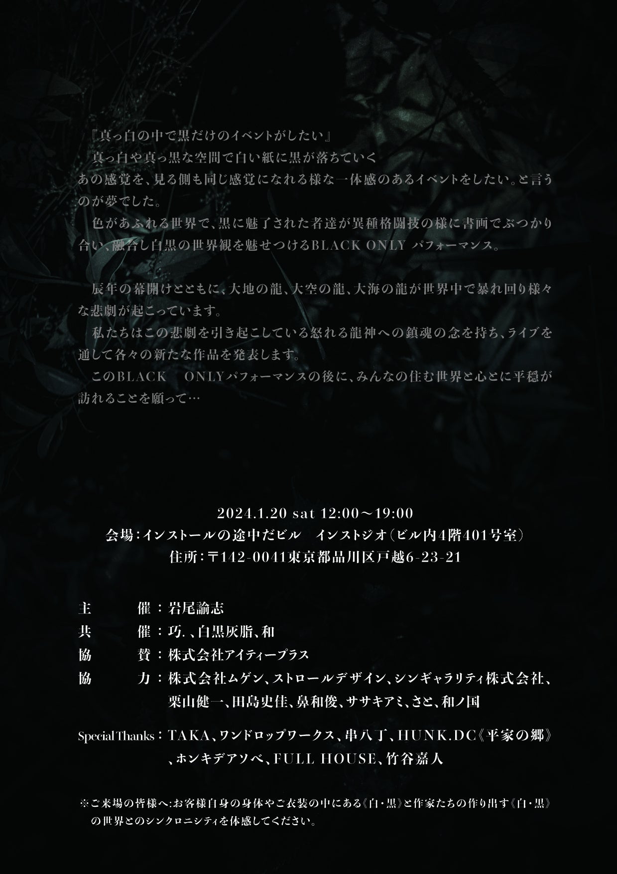 その第一弾となるのが、主催の岩尾諭志(Satoshi Iwao)が声かけ役となり、功.(TAKUMI)、白黒灰脂(monochrome haiji)、和(kazz)といった《白・黒》の世界観で独自の作品を作り続ける4名のアーティストが集結し、1日限りのライブパフォーマンスを披露する【黒の血盟-BLACK ONLY LIVE PARFORMANCE-】イベントだ。