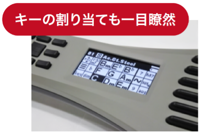 ディスプレイにはキー(調)やそのキーに対応したコードが表示され、ボタンに割り当てられた機能と連動しています。