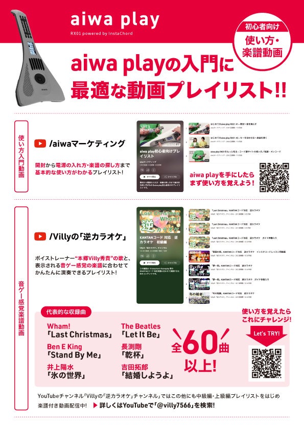 JENESIS株式会社の子会社であるアイワマーケティングジャパン株式会社(本社:東京都千代田区、代表取締役社長:藤岡 淳一、以下 アイワマーケティングジャパン)は、電子楽器【aiwa play】に専用のソフトケースとストラップ、楽譜動画のプレイリストをセットにしたお得な初心者向けセットを、aiwaダイレクトサイトとインスタコード公式ストアにて「100セット限定:セット価格38,000円(税込)」で順次販売を開始いたします。