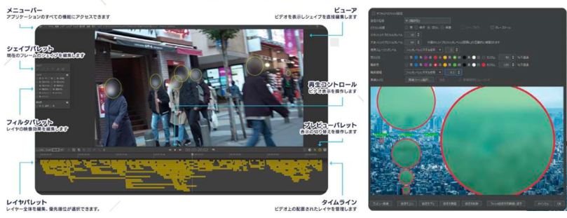 顔・頭部・ナンバープレートをAIで自動検出しマスク・モザイク候補を自動抽出します。また独自編集ツールによりAIで自動検出したマスク・モザイク処理の編集も簡単に行うことが出来、任意の場所に自動追尾機能で簡単にマスク・モザイク処理を追加することが可能です。