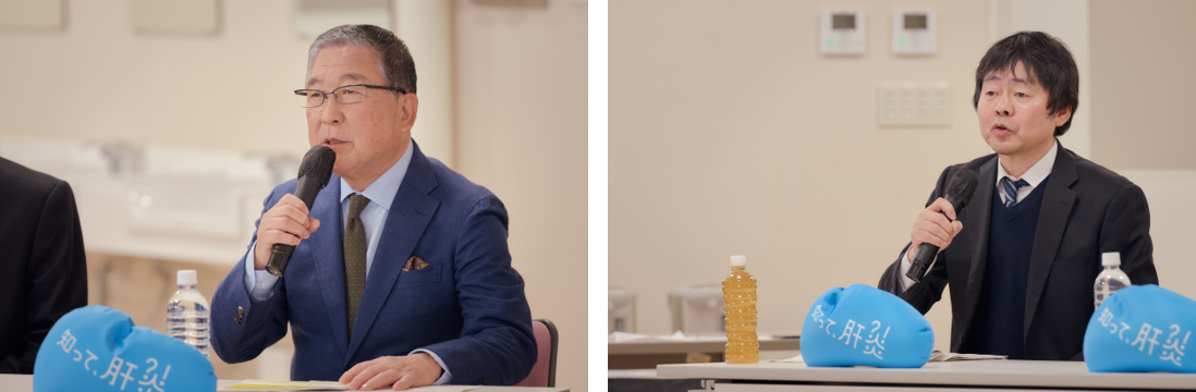 同席した宮坂先生は、ウイルス性肝炎について「肝炎ウイルスに感染することで、慢性的な炎症が繰り返され、肝臓が硬くなってしまいます。また、進行していくと、肝硬変や肝がんなど、治療が難しい病気に重症化してしまいます。」と話し、続けて徳光氏は、「肝臓は“沈黙の臓器”と言われており、シグナルがないんです。症状が重症化するとがんになってしまったりと、大変なことになりますので、そうなる前に“早期発見・早期治療”に取り組むことが非常に重要です。早期発見すれば副作用がほとんどない飲み薬で治療が出来るので、是非いわちくの従業員の皆さまにもウイルス検査を一度受けていただきたいです。」と話しました。