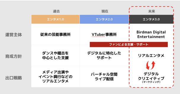 これからのエンタメ3.0では、”ファン(≒推し)によるプロデュース力”が増している中、デジタルとリアルエンタメの融合がさらに重要となります。また、M/Z世代を対象に社会的意義やパーパスを含む本質的なマーケティング設計も求められています。その為、Birdmanは、デジタルクリエイティブとリアルエンタメの融合を強みとし、未来のアーティストプロデュースの形を目指します。