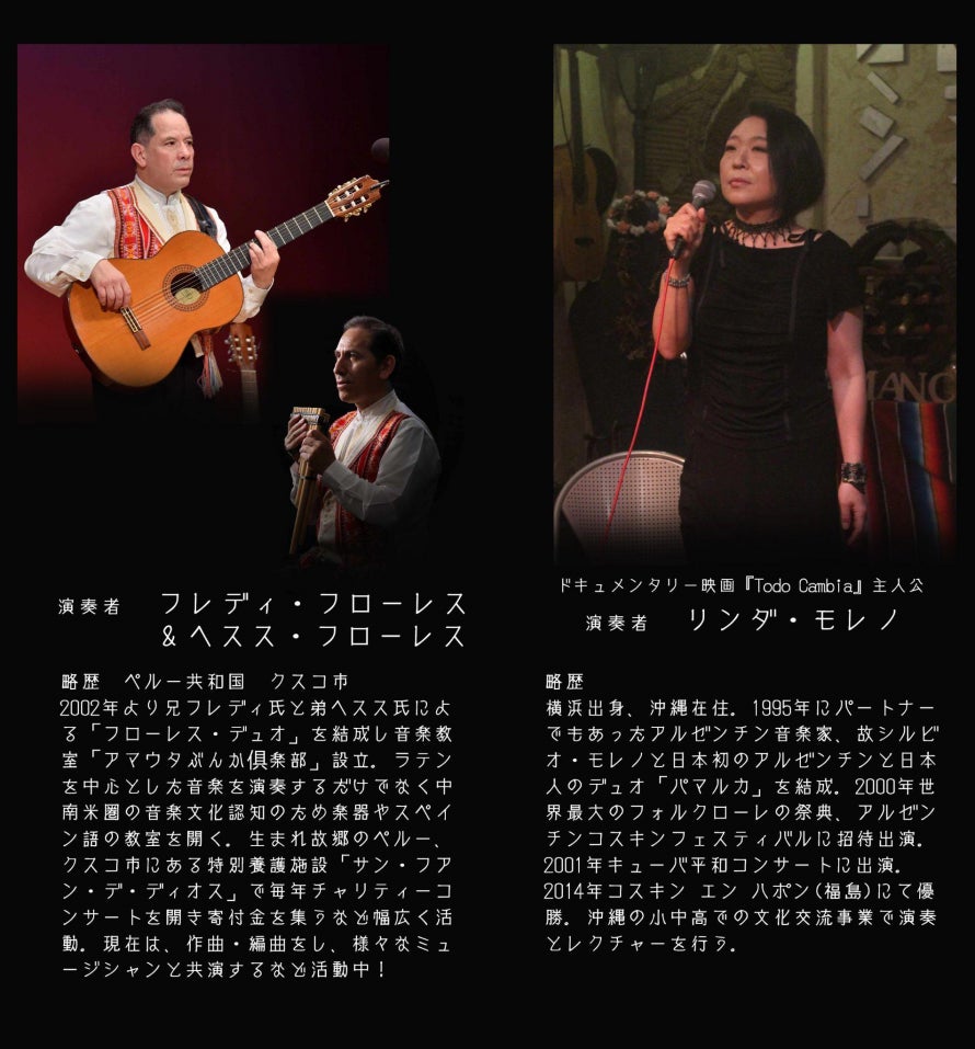 今回のイベントでは彼の妻であるリンダ・モレノさんと、彼の大親友であるフローレス兄弟が登壇し、南米のフォルクローレ音楽をライブ披露します。
