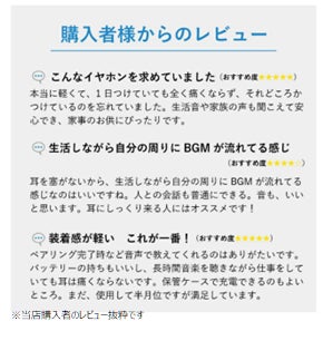 ・ウォーキングやジョギングなど周囲の音を確認したい屋外での使用をはじめ、オンライン会議やコンテンツ視聴など長時間装着して使用する時など、さまざまなシーンで快適に”ながら聴き”が楽しめる。