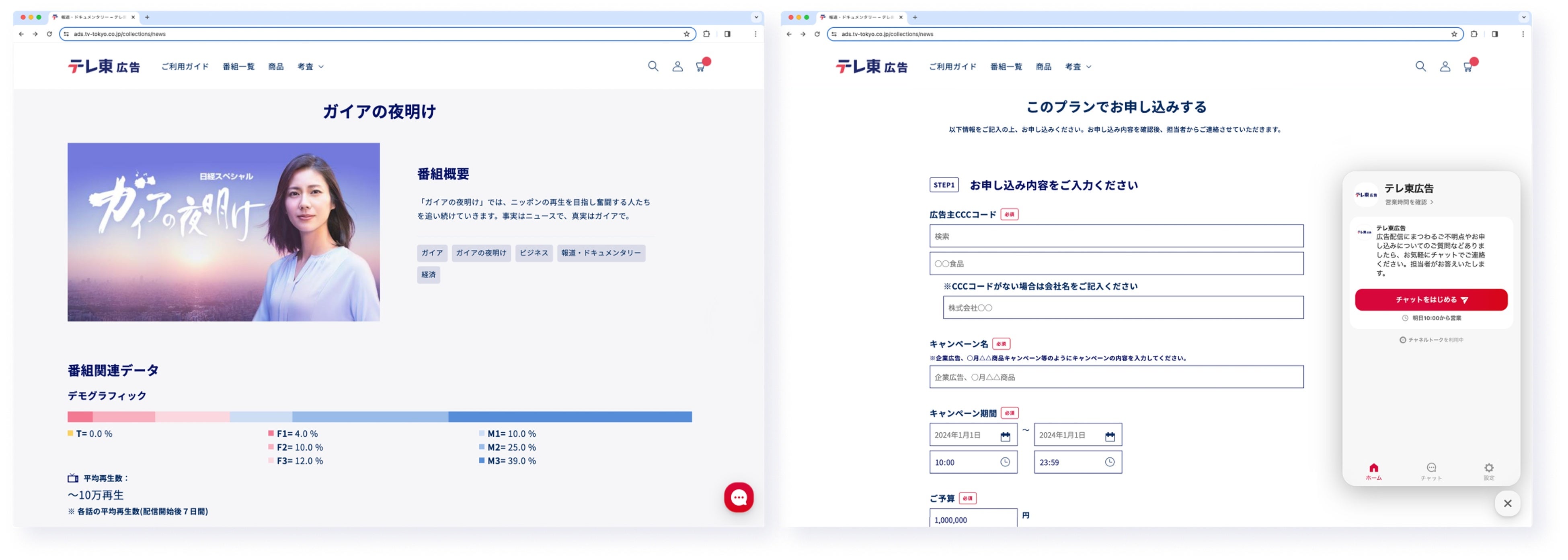 ほしい情報に24時間、いつでもアクセス可能です。例えば、各番組の属性情報を見て、好みに合う番組への広告出稿をプランニングすることができ、見積もり、広告審査、申し込みまで行うことができます。また、弊社担当につながるチャットアプリなど、便利なツールをご用意しています。