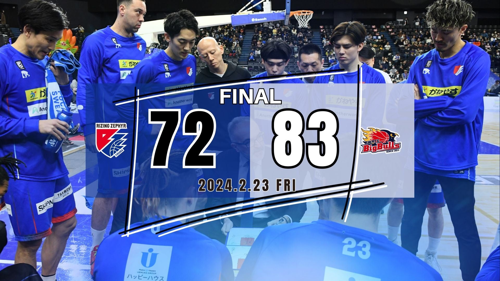 2024年2月23日(金)に開催されました【ライジングゼファーフクオカvs.岩手ビッグブルズ】において“福岡72-83岩手”の結果となりましたことお知らせいたします。