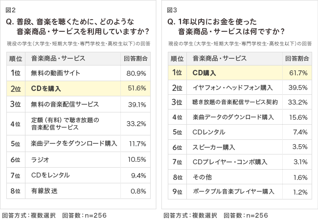 現役の学生(大学生・短期大学生・専門学校生・高校生以下)に対し、「音楽を聴くために利用している音楽商品・サービス」を質問したところ、「無料の動画サイト」(80.9%)に次いで「CD 購入」(51.6%)が2位となりました。また、「1年以内にお金を使った音楽商品・サービス」を聞いたところ、「CD購入」(61.7%)が最多となり、音楽配信サービスが普及している昨今でも多くの学生がCDを購入していることがわかりました。