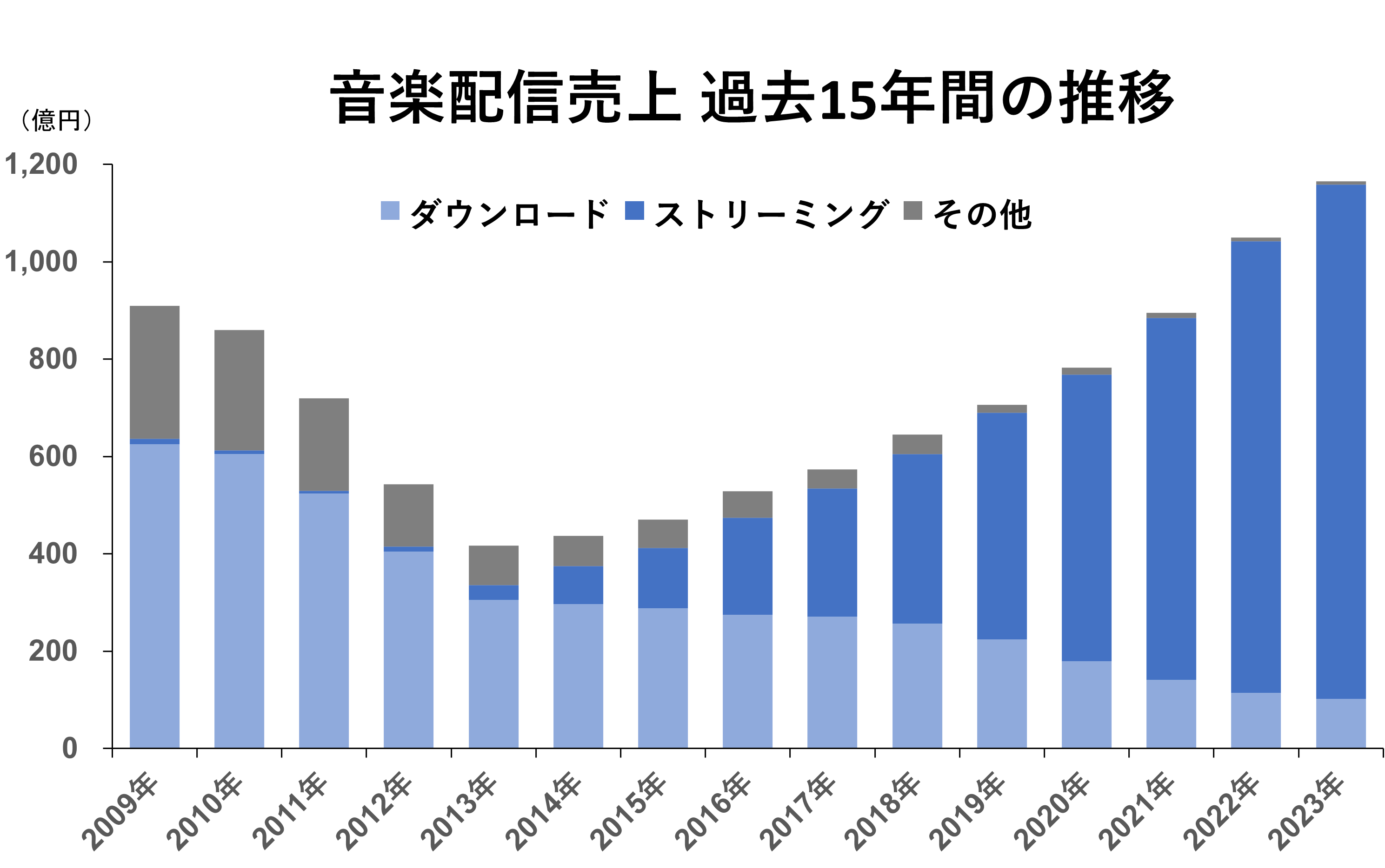 「ストリーミング」は前年比114%の1,056億円と伸長を続け、年間売上において初めて音楽配信売上全体の9割を超えました。