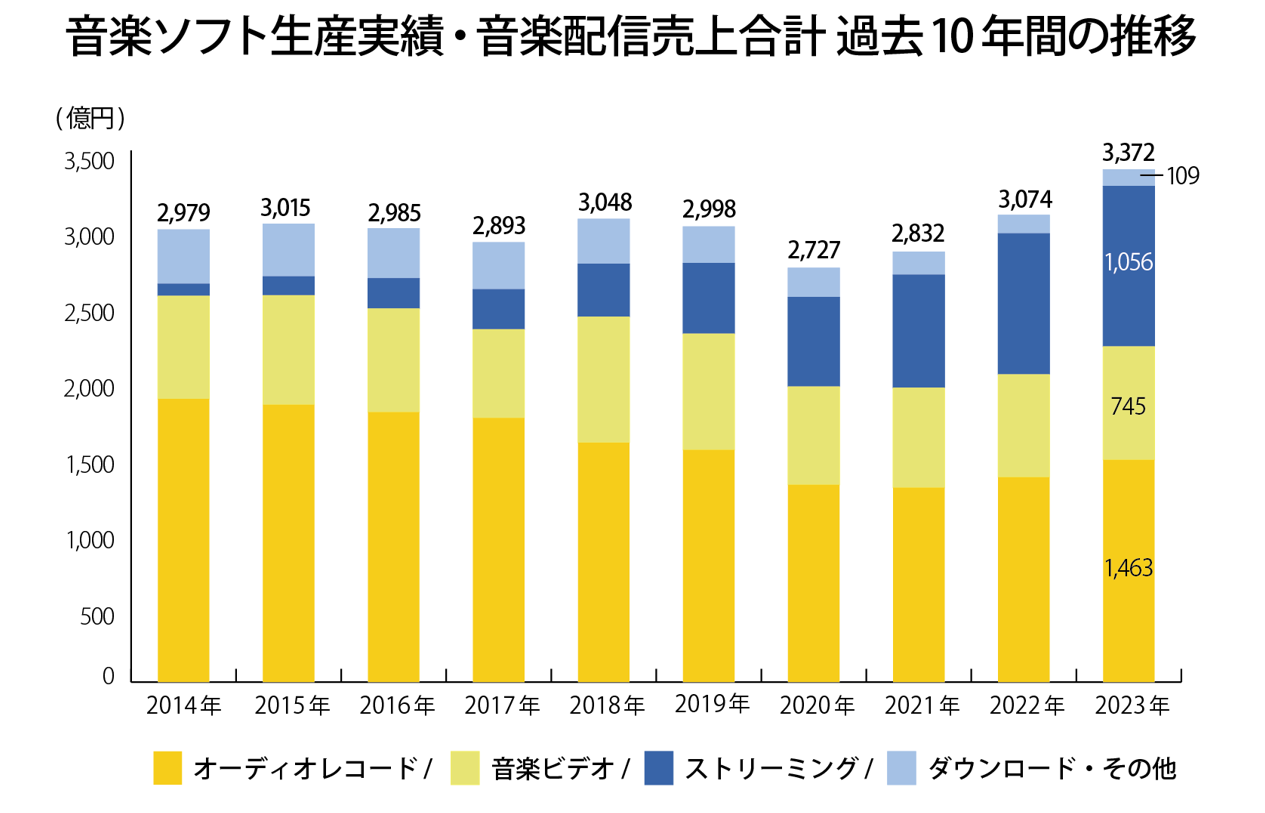 1月発表の2023年音楽ソフト(オーディオレコードと音楽ビデオの合計)生産金額2,207億円と、同年音楽配信売上1,165億円の合計は3,372億円(対前年比110%)となり、3年連続プラス成長を遂げました。