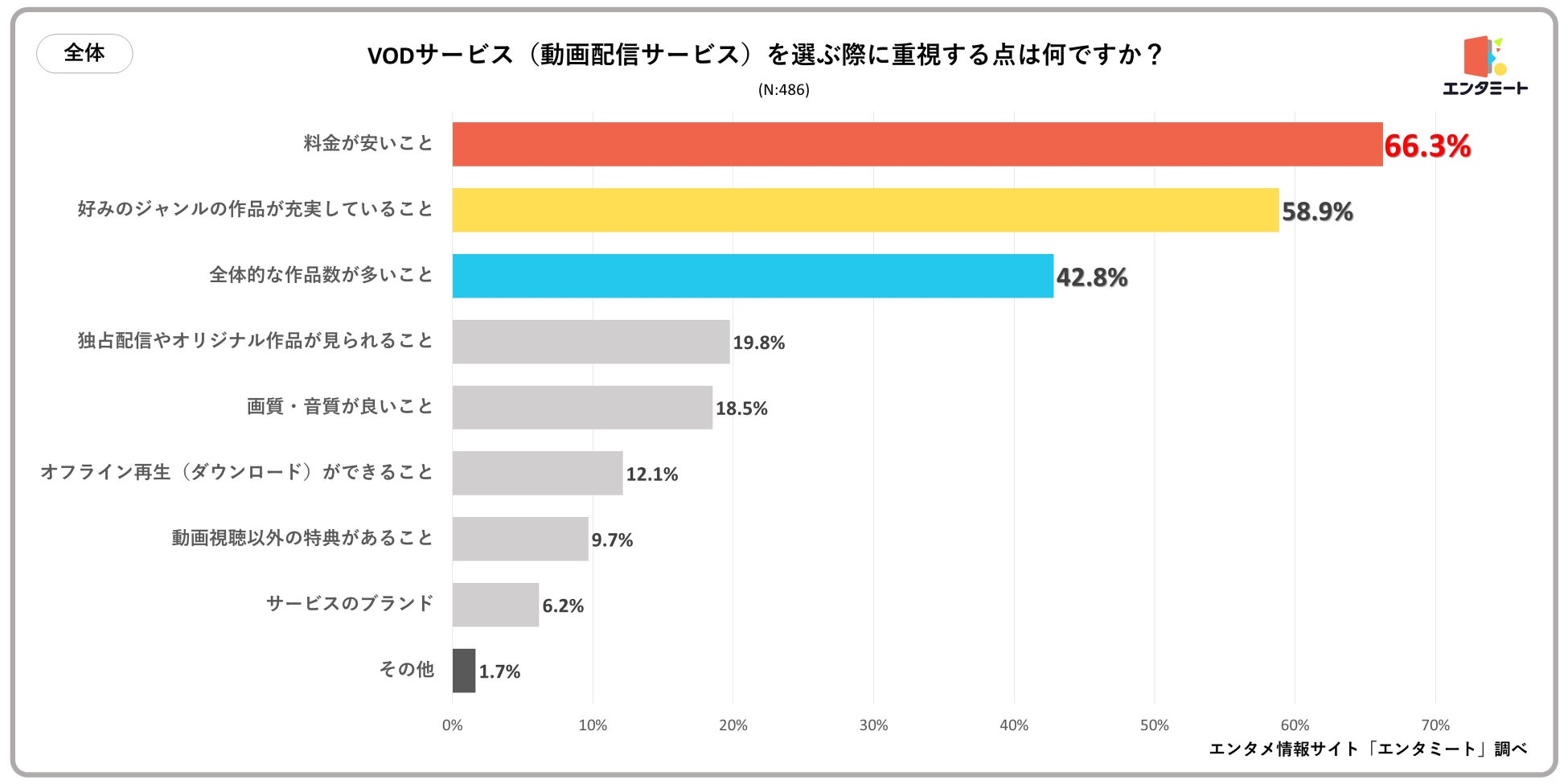全国の10代~50代を対象に、「VODサービス(動画配信サービス)を選ぶ際に重視する点は何ですか?」というアンケートを実施したところ、最も多かった回答は「料金が安いこと」で66.3%でした。次いで、「好みのジャンルの作品が充実していること」が58.9%、「全体的な作品数が多いこと」が42.8%で続くという結果になりました。