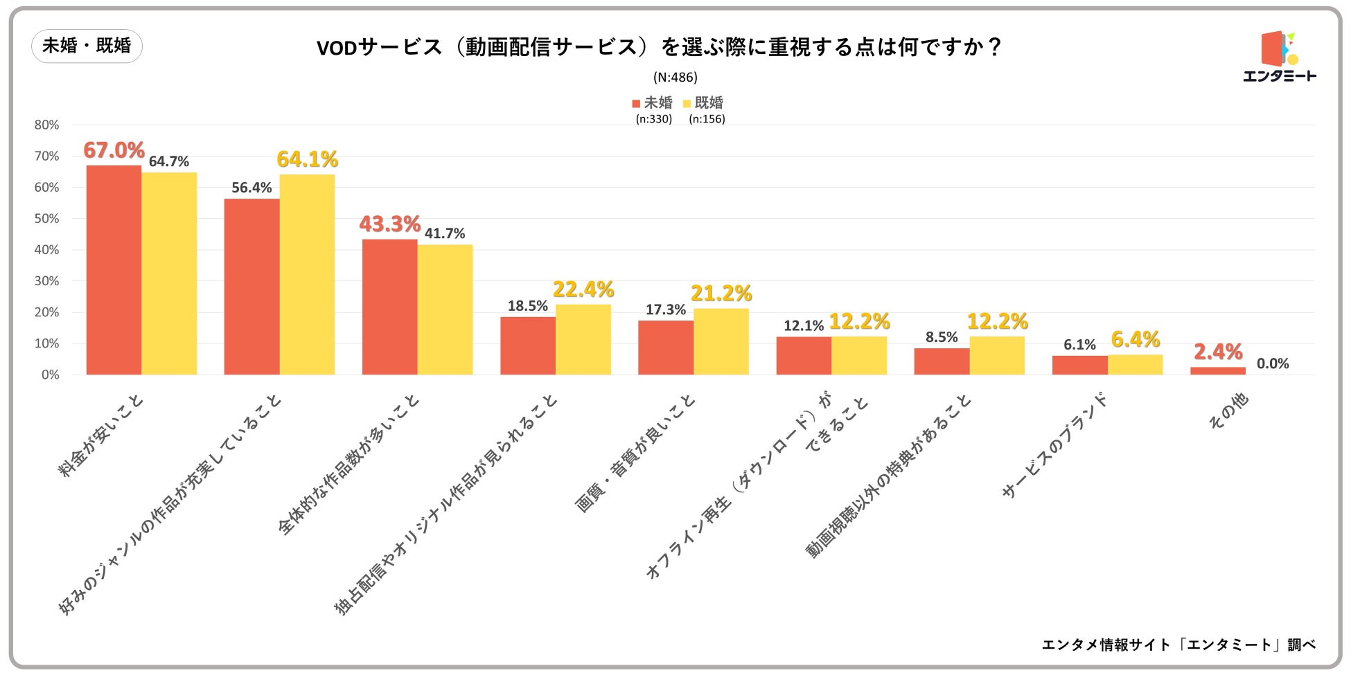 未婚・既婚別で見ると、ほとんどの項目で差はありませんでしたが、「好みのジャンルの作品が充実していること」では既婚の回答率が約10%高くなりました。既婚の人の場合、子供がいる家庭では普段テレビを教育番組など子供のために活用していることも多いと考えられ、自分の見たいジャンルの番組や作品はVODで視聴するという使い分けをしているのかもしれません。