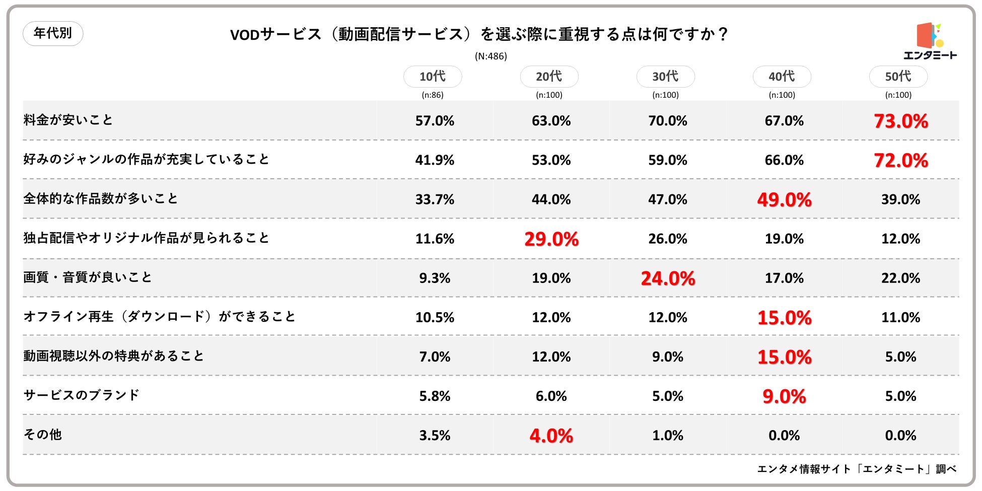 株式会社ドリーム・トレイン・インターネット(本社:東京都渋谷区、代表取締役社長:清水高、以下「DTI」)が運営する「毎日を楽しくする作品に出会える」をコンセプトにアニメ、映画、ドラマの作品情報や動画配信サービスなどの情報を配信している「エンタミート」は、全国の10代~50代の男女500人を対象にVODサービスに関するアンケートを実施し、年代別等の特徴についてまとめました。