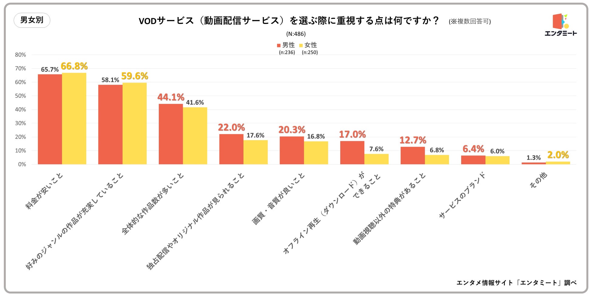 男女別で見ると、ほとんどの項目で差はありませんでしたが、「オフライン再生(ダウンロード)ができること」では約9%、「動画視聴以外の特典があること」では約6%男性の回答率が高くなりました。VODはインターネットを介していつでもどこでも好きな作品を視聴できることが特徴ですが、男性の場合はオフライン再生や特典といったサービスの付加的な側面も重視している人が多いようです。