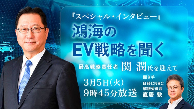 株式会社日経CNBC(本社:東京都千代田区、代表取締役社長:竹之内源市、以下「日経CNBC」)は3月5日(火)9時45分に、「スペシャル・インタビュー『鴻海のEV戦略を聞く―最高戦略責任者、関 潤氏を迎えて』」を放送します。
