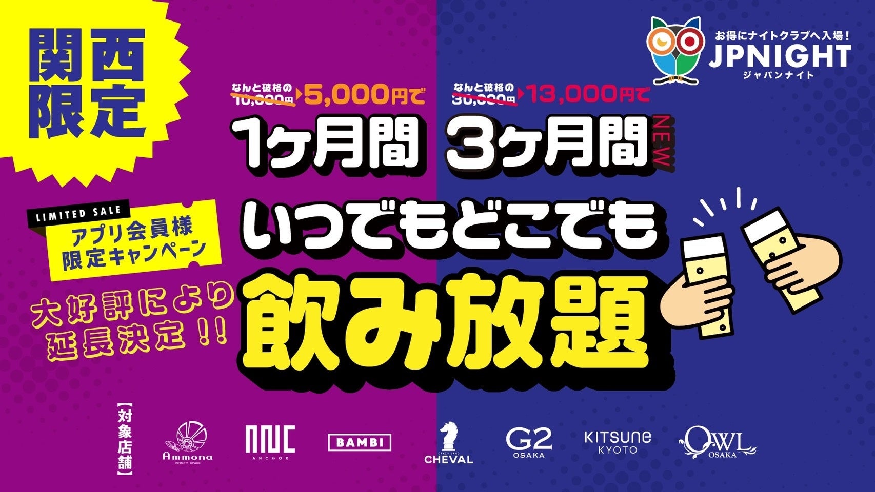 JPNIGHTでは関西のナイトクラブ限定で、1ヶ月間飲み放題プランを月額5,000円で提供しています