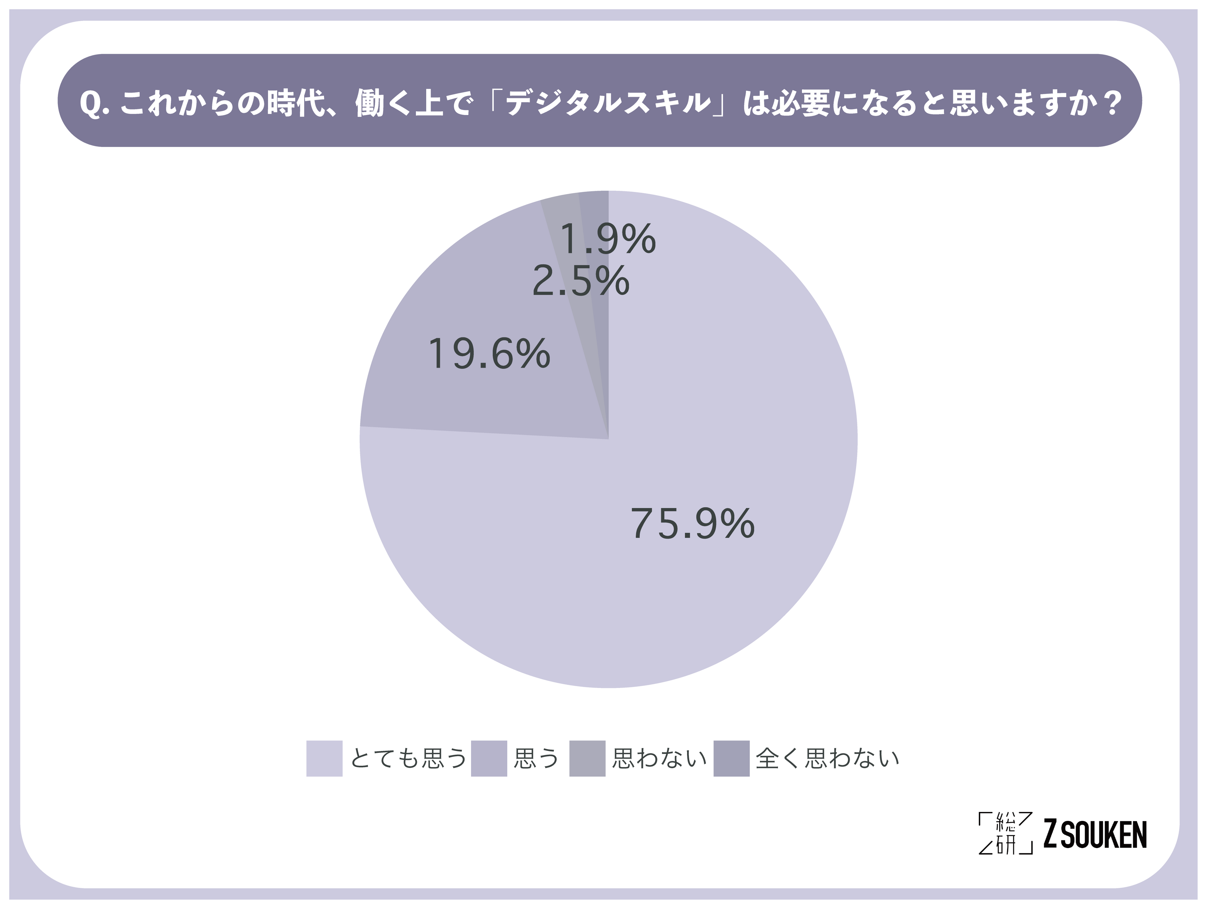 アンケートにて「これからの時代、働く上で「デジタルスキル」は必要になると思いますか?」と尋ねたところ『とても思う(75.9%)』と回答した方が最も多く、次に多い回答が『思う(19.6%)』という結果になり、アンケートに回答したZ世代の95%以上がこれからの時代、働く上で「デジタルスキル」は必要になると思っていることがわかりました。
