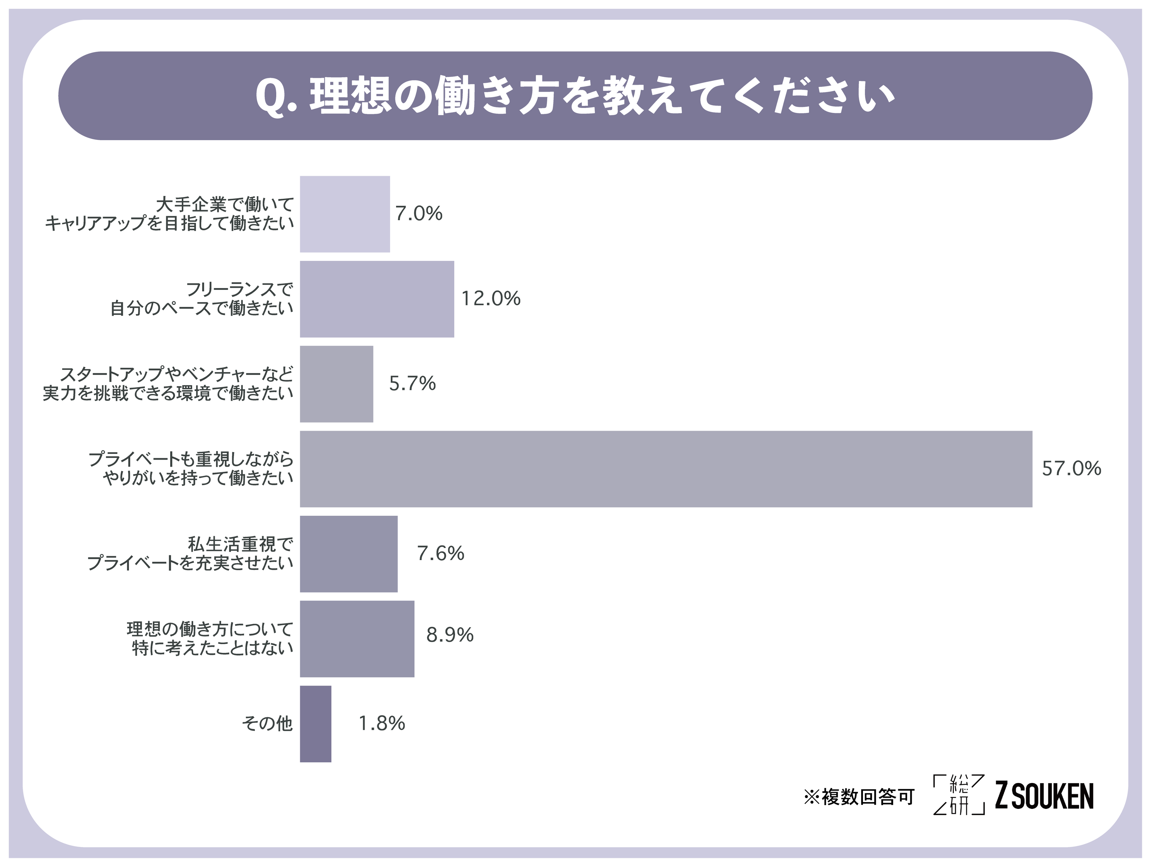 アンケートにて「理想の働き方を教えてください」と尋ねたところ、『プライベートも重視しながらやりがいを持って働きたい(57.0%)』が最も多く、次いで『フリーランスで自分のペースで働きたい(12.0%)』が多い結果となりました。