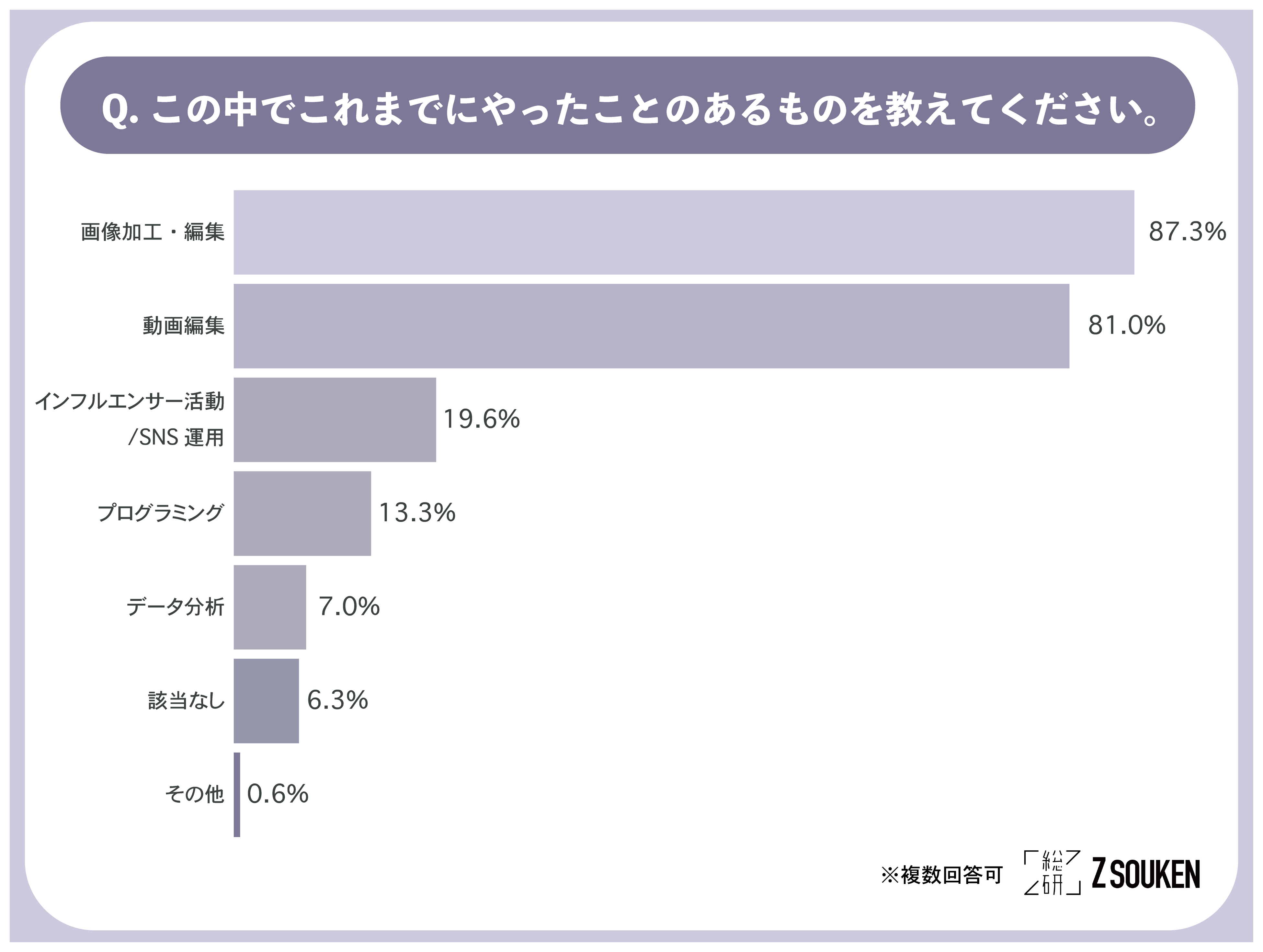 アンケートにて「この中でこれまでにやったことのあるものを教えてください」と尋ねたところ、『画像加工・編集(87.3%)』と回答した方が最も多く、次いで『動画編集(81.0%)』という結果になりました。