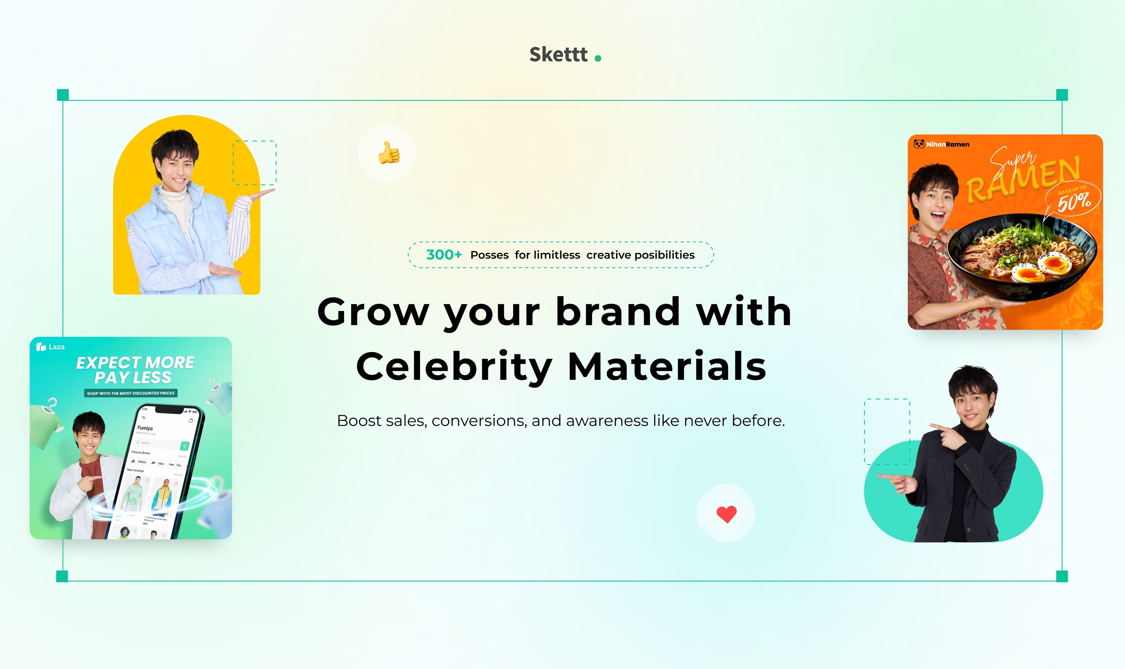 そこで、より多くの企業にタレント活用施策を通じたマーケティング支援を届けるために、開発されたのが「Skettt」です。「Skettt」は最短1ヶ月から全国的に認知されている有名タレント素材(画像)を活用できることを強みとするIPマーケティング包括支援サービスです。