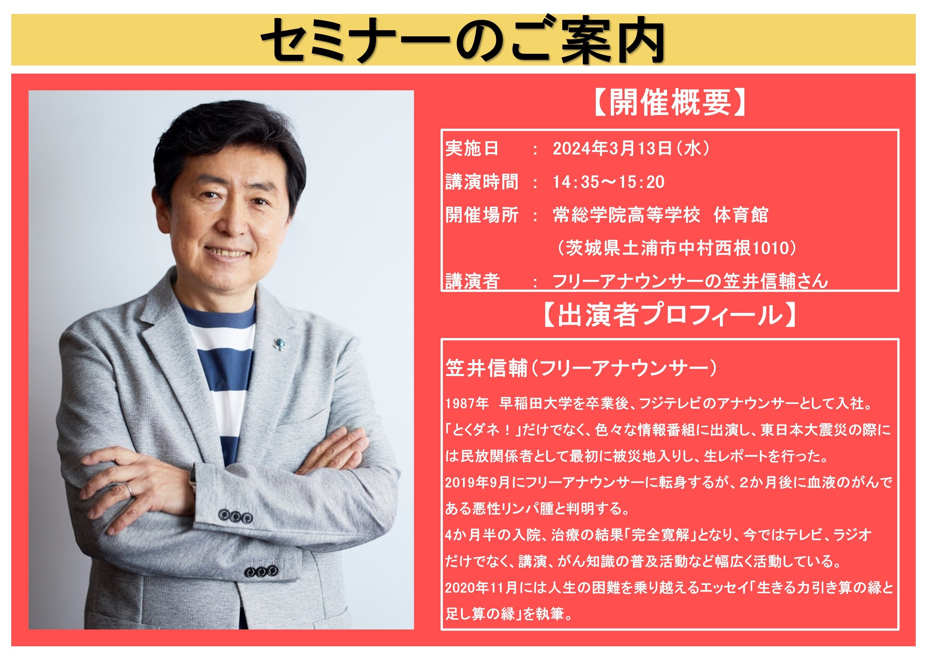 輸血経験者であるフリーアナウンサーの笠井信輔さんを迎え、ご自身の闘病体験、輸血治療の経験を通して、在校生の方を対象に”献血” ”いのち”の大切さを伝えていきます。