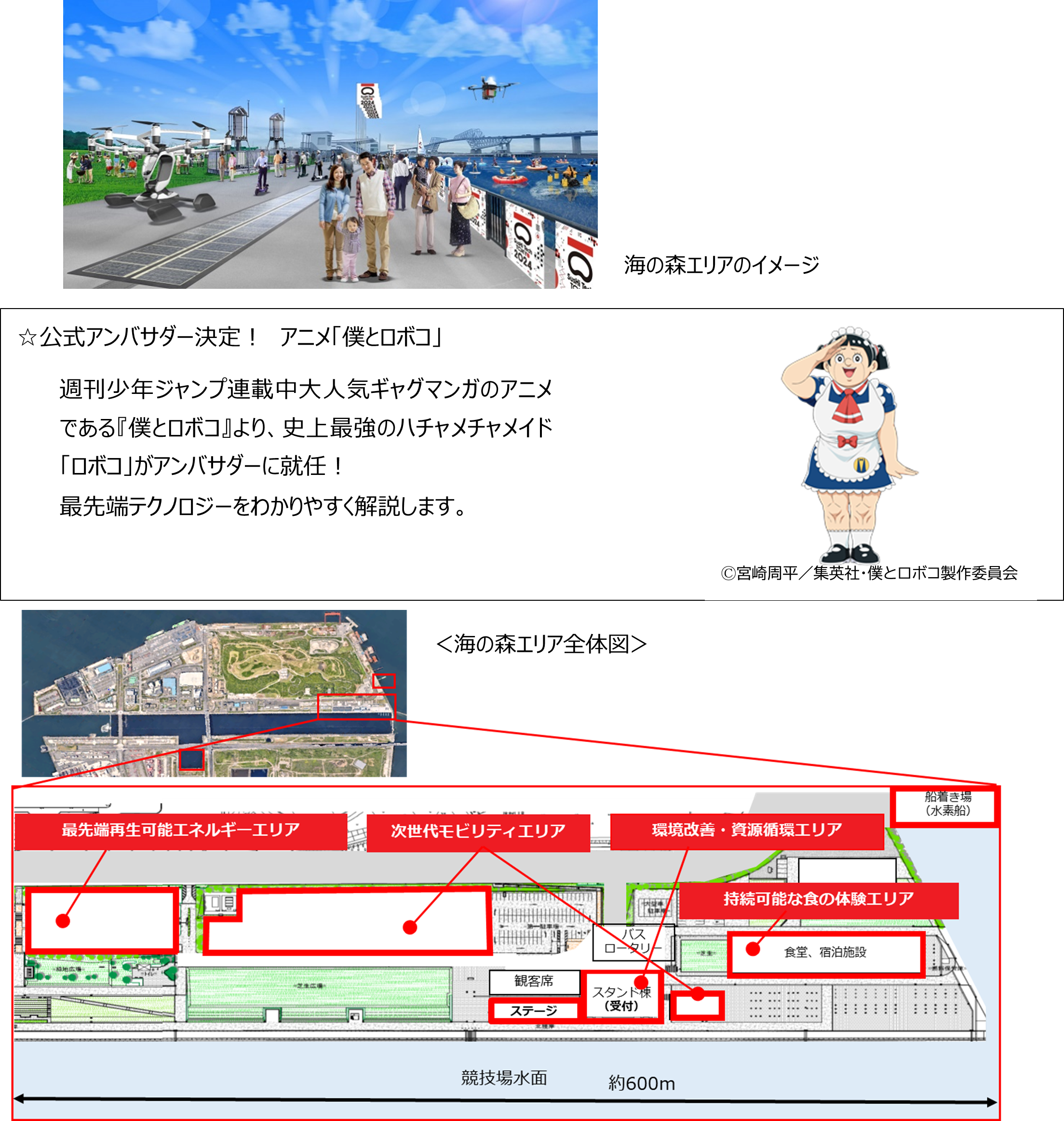 「海の森エリア」には、“陸・海・空”の広大なフィールドが広がっています。フィールドの高いポテンシャルを生かし、先行プロジェクト(※)として「次世代モビリティ」、「最先端再生可能エネルギー」、「環境改善・資源循環」の3つのテーマで東京が目指す「未来のまち」の実現に関わるさまざまな最先端テクノロジーの実装が行われています。「海の森エリア」では、これらの展示を行うとともに、アニメ「僕とロボコ」のキャラクター・ロボコの案内で、先行プロジェクトの技術をわかりやすくご理解いただけるよう、様々なコンテンツの実演・体験を用意します。