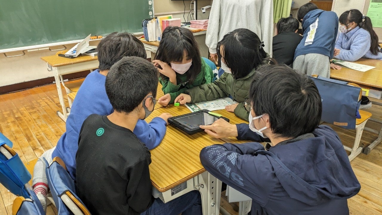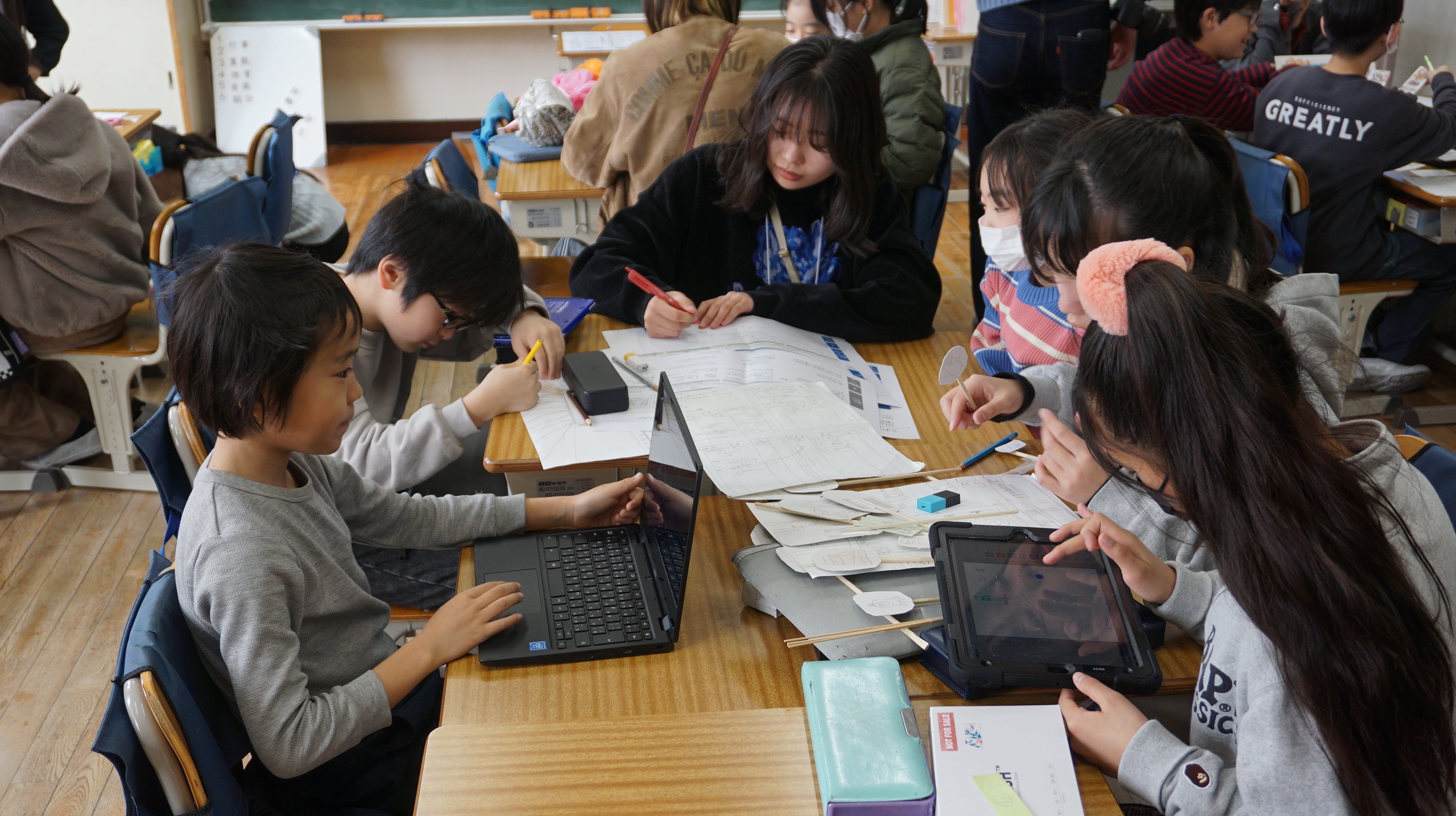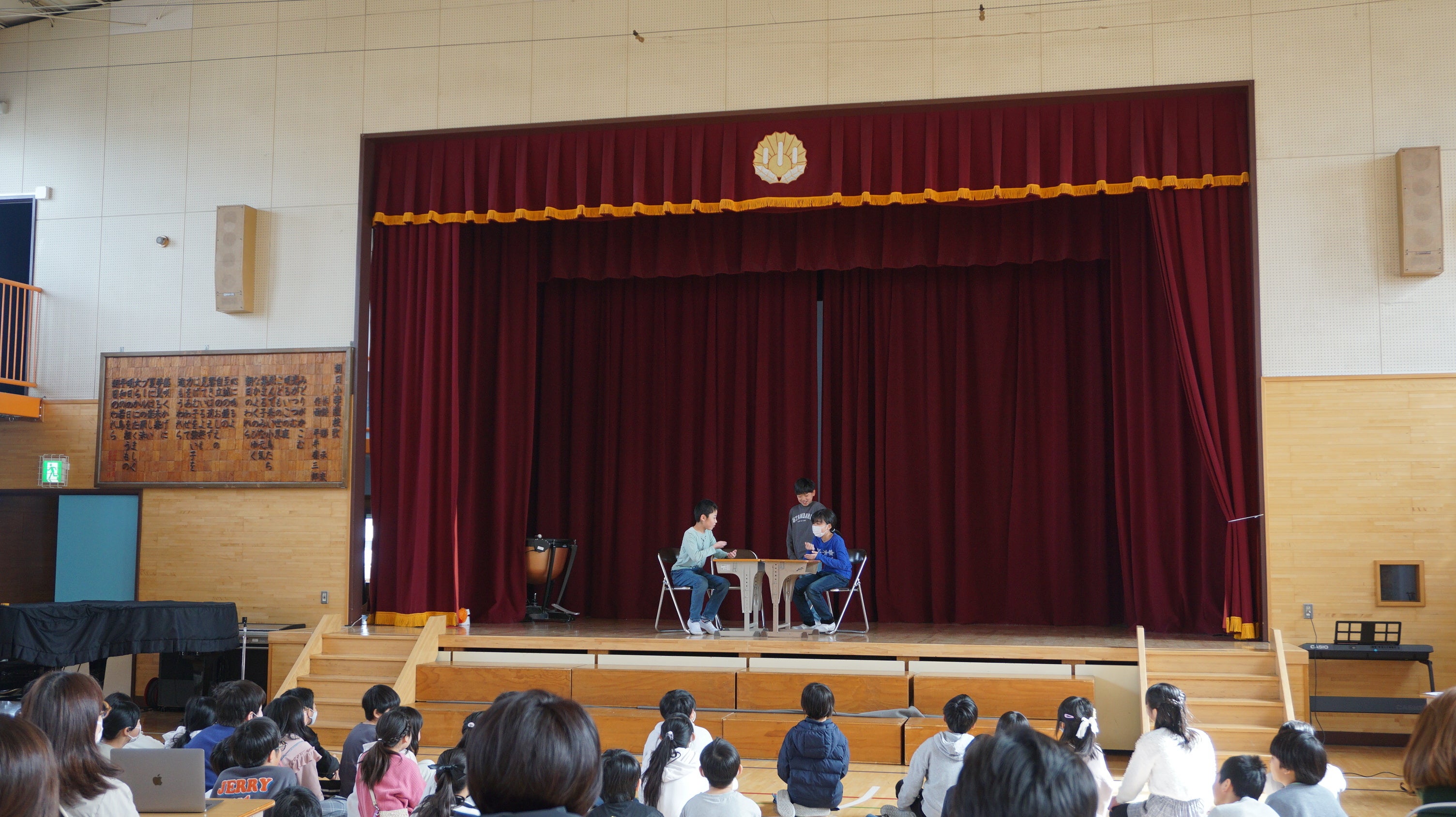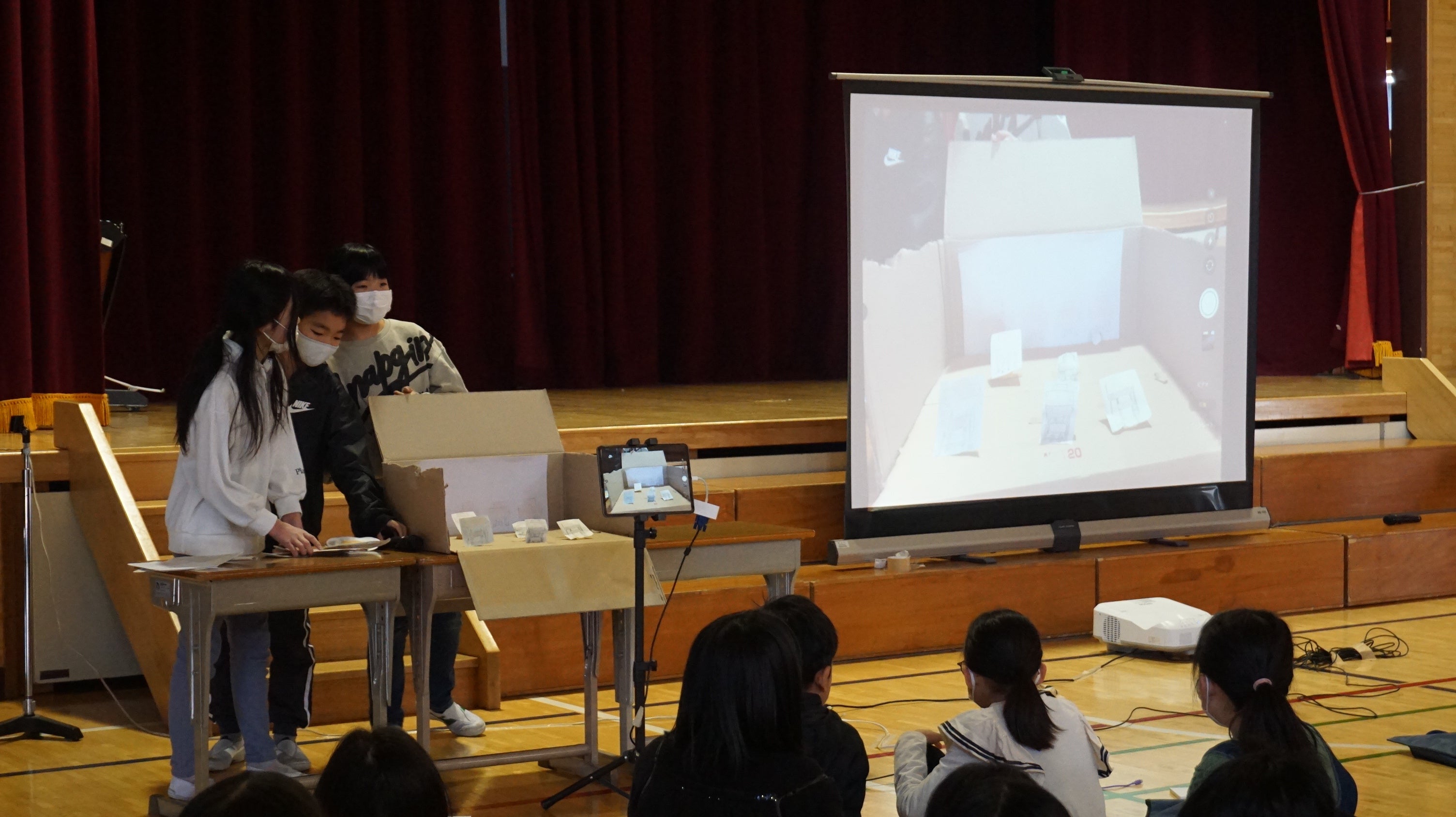 3日目は、公開授業の場で保護者に成果発表を行いました。こどもたちは、人形劇、演劇、紙芝居など、各々が考えた手法で発表しました。グループによって、プログラミング、小道具、音など、様々な工夫が見られました。サポートする学生チームも一緒につくりあげてきたグループの発表を責任もって最後まで見届け、発表後は、学生と児童が一緒になって達成感を共有していました。