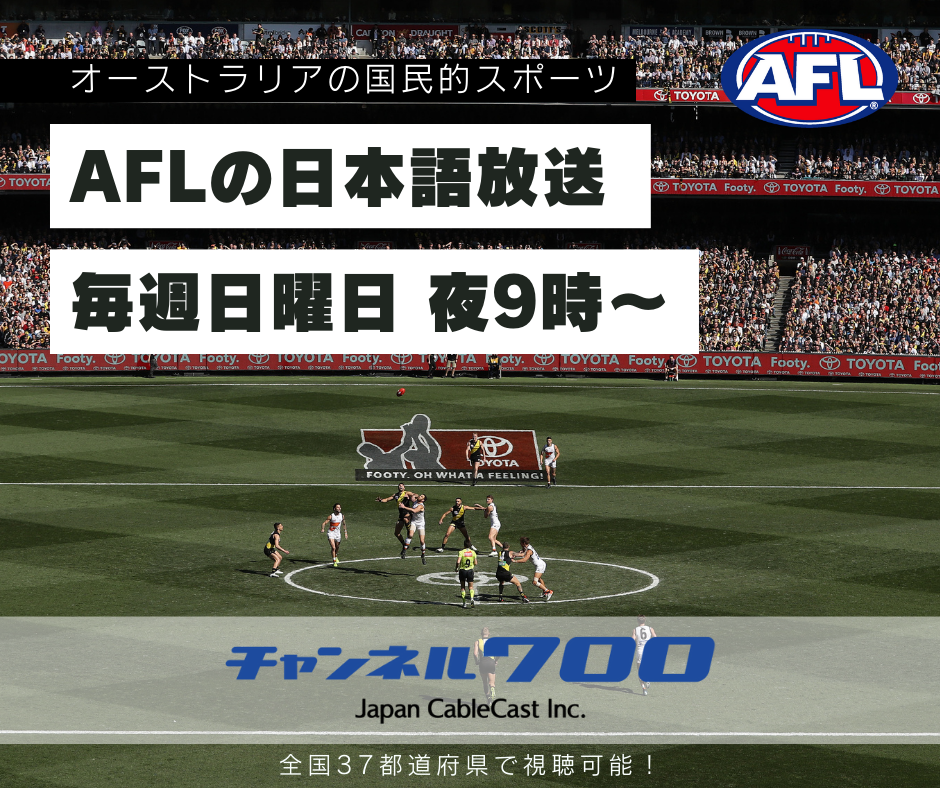 今シーズンもオーストラリアで人気を誇る「AFL」の試合に日本語の解説を入れた映像をチャンネル700にて放送されることが決定いたしました。チャンネル700は日本のケーブルテレビ局を結ぶ全国ネットワークで96局に採用、視聴可能世帯は約320万世帯となっているチャンネルです。またそのうち27局/約234万世帯は、リモコンボタンひとつで見られる地デジコミュニティチャンネルでも視聴可能なチャンネルとなっています。