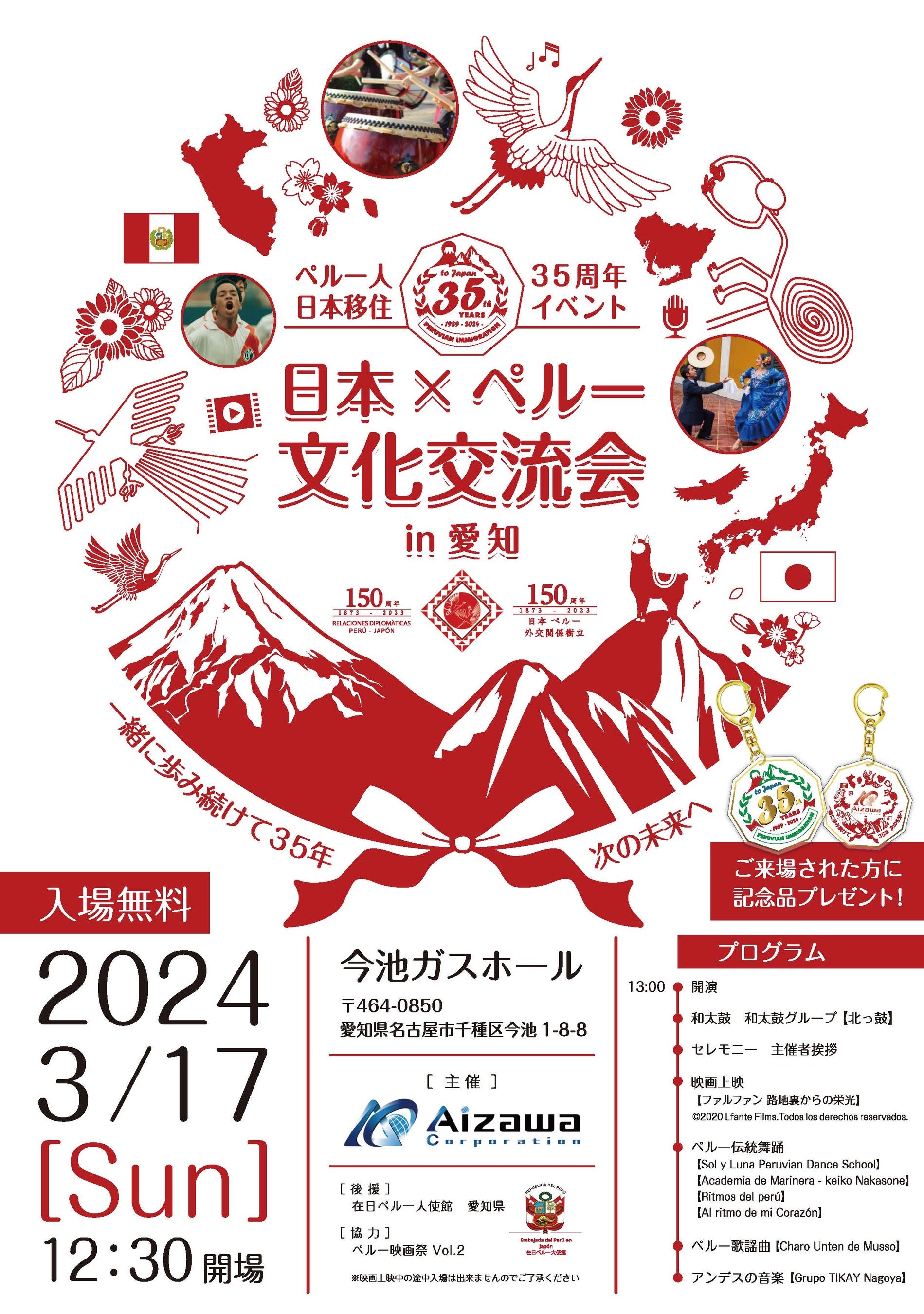 【株式会社Aizawa Corporation】は、愛知県で開催される『日本×ペルー文化交流会 in 愛知』をご案内いたします。ペルーと日本の修交150周年を記念し、ペルー人の日本移住35周年も重なるこの素晴らしいイベントでは、ペルーの映画、伝統舞踊、歌謡曲、アンデスの音楽などが楽しめます。日本×ペルーの文化の魅力を感じるこの機会をお見逃しなく!