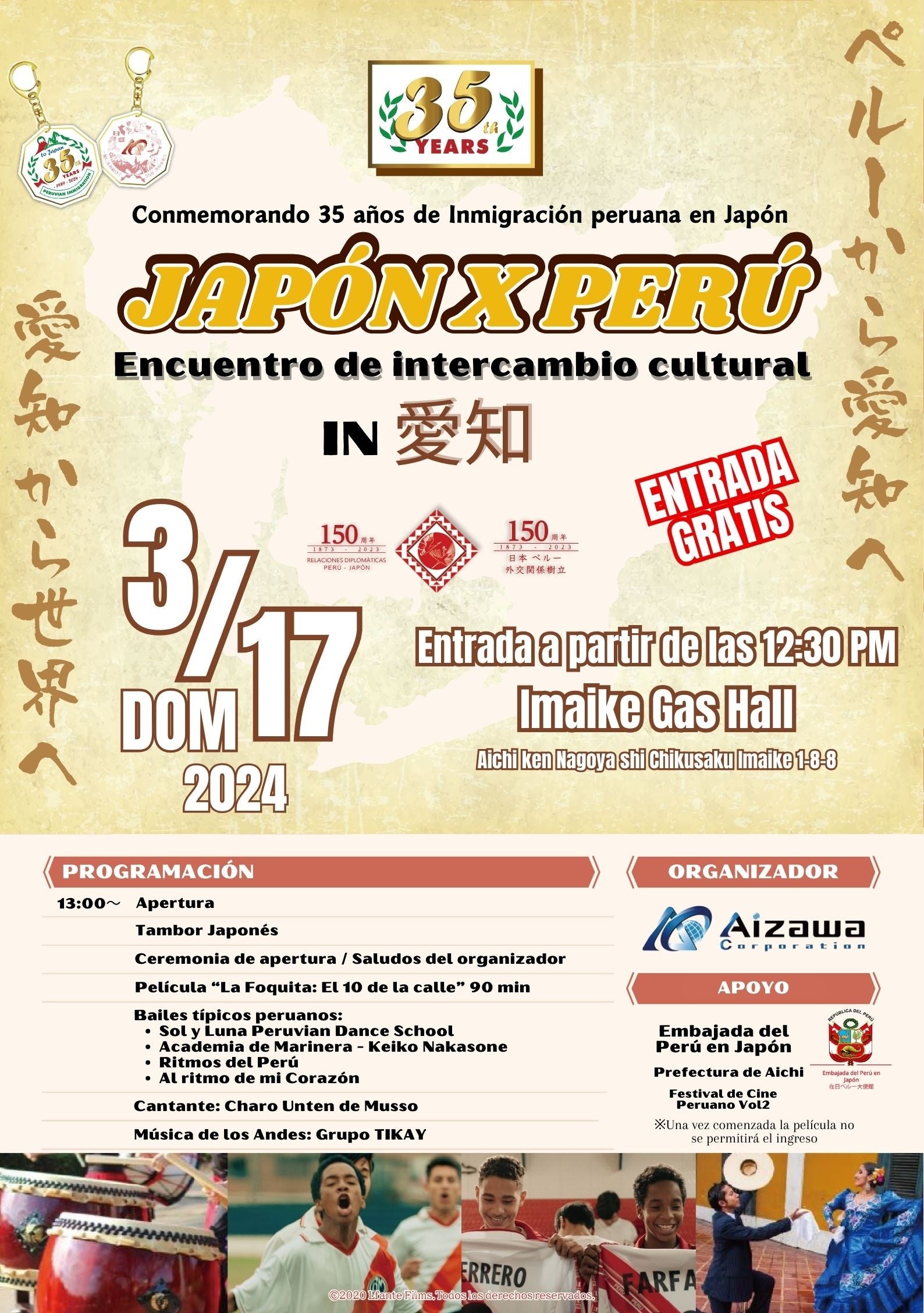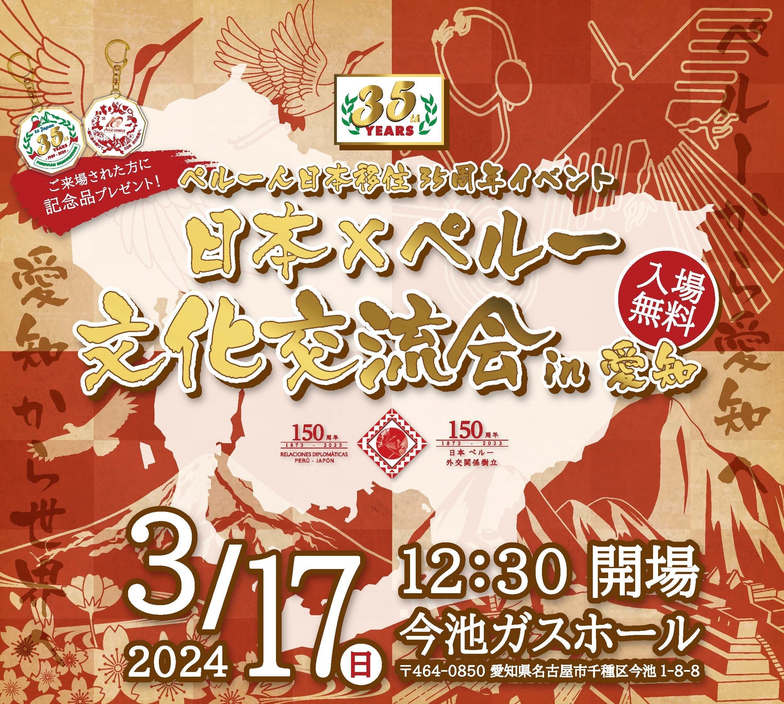¡Celebremos juntos los 35 años de la inmigración peruana a Japón!Únete a nosotros para un evento inolvidable que destaca la rica cultura peruana que ha enriquecido nuestras vidas aquí en Japón.¡Música, presentaciones de danzas, y momentos emocionantes te esperan! ENTRADA GRATIS FECHA: Domingo 17 de Marzo LUGAR: Imaike Gas Hall (Aichi- Nagoya) HORA: A partir de las 12:30 PM