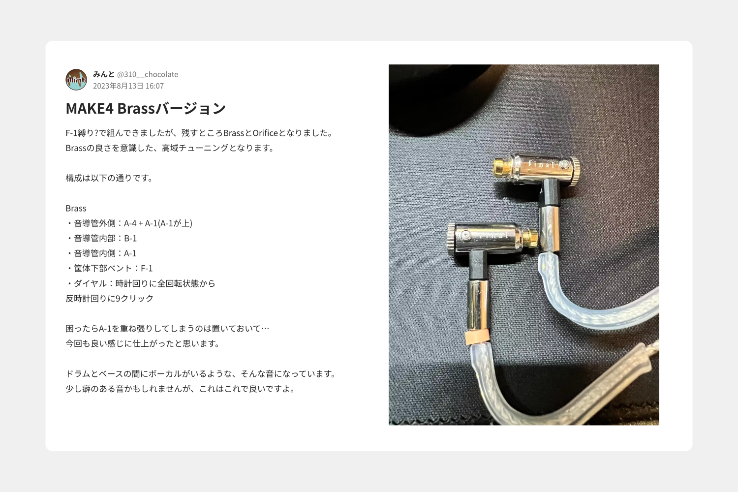 また、MAKER’Sではユーザーの皆様がDIYイヤホンのチューニングの方法を記載したレシピを公開したり、好きなアーティストの楽曲とMAKEシリーズを組み合わせた時の聴こえ方を投稿したりとMAKEシリーズを通じたコミュニティの場として活用されています。