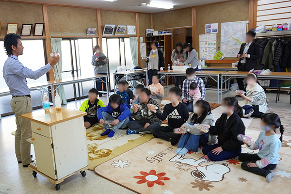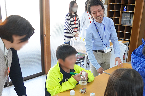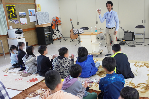 空きペットボトルを使ってマラカス作りを体験した後、自分で作ったマラカスを使って、ギター、パーカッションと一緒にセッションをする内容です。