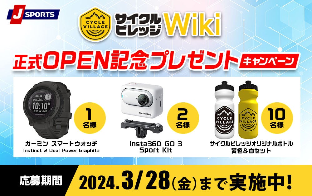株式会社ジェイ・スポーツ(本社 東京都江東区、代表取締役社長 長谷 一郎、以下「J SPORTS」 ※1)は、自転車を楽しむ人たちが集まるコミュニティサイト「サイクルビレッジ」内にサイクリングルート・スポットの共有機能「サイクルビレッジWiki」の正式版を3月15日に公開いたしました。正式公開を記念して、3月28日までサイクルビレッジWiki正式OPEN記念豪華プレゼントキャンペーンを実施したします。ぜひご参加ください。