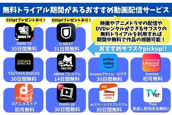 月額定額制(サブスク)動画配信サービスの無料トライアル期間が一目でわかるよう、人気の10サービスをピックアップしまとめた早見表です。