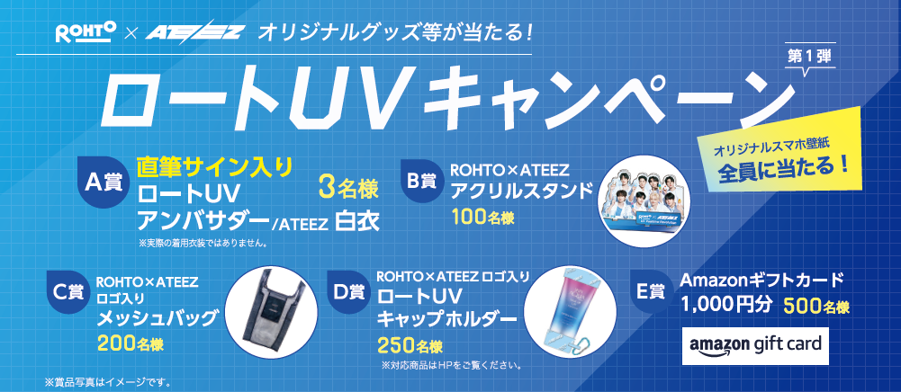 3月25日(月)から5月31日(金)23:59までの期間中に、ロートUVの「スキンアクアシリーズ」「サンプレイシリーズ」「オレゾシリーズ」の商品から税込1,000円以上ご購入の上WEBで応募いただくと、ATEEZ×ロートUVオリジナルグッズ等が抽選で当たる「ロートUVキャンペーン第1弾」を実施します。また、マツモトキヨシ・ココカラファイングループの店頭でロートUVの「スキンアクアシリーズ」「サンプレイシリーズ」の商品から税込1,000円以上ご購入いただくと、その場でロート×ATEEZのオリジナルトレカがもらえるキャンペーンも3月25日(月)からスタート(賞品がなくなり次第終了)します。さらに、ロートUV X公式アカウント(@rohto_uv) をフォロー&リポストすることでオリジナルグッズ等が抽選で当たるキャンペーンも、3月24日(日)12:00からスタートします。