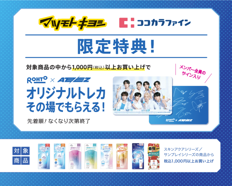 内容 マツキヨココカラの店頭で下記対象ブランドの商品から税込1,000円以上ご購入いただいた方にその場でROHTO×ATEEZオリジナルトレカをプレゼント。