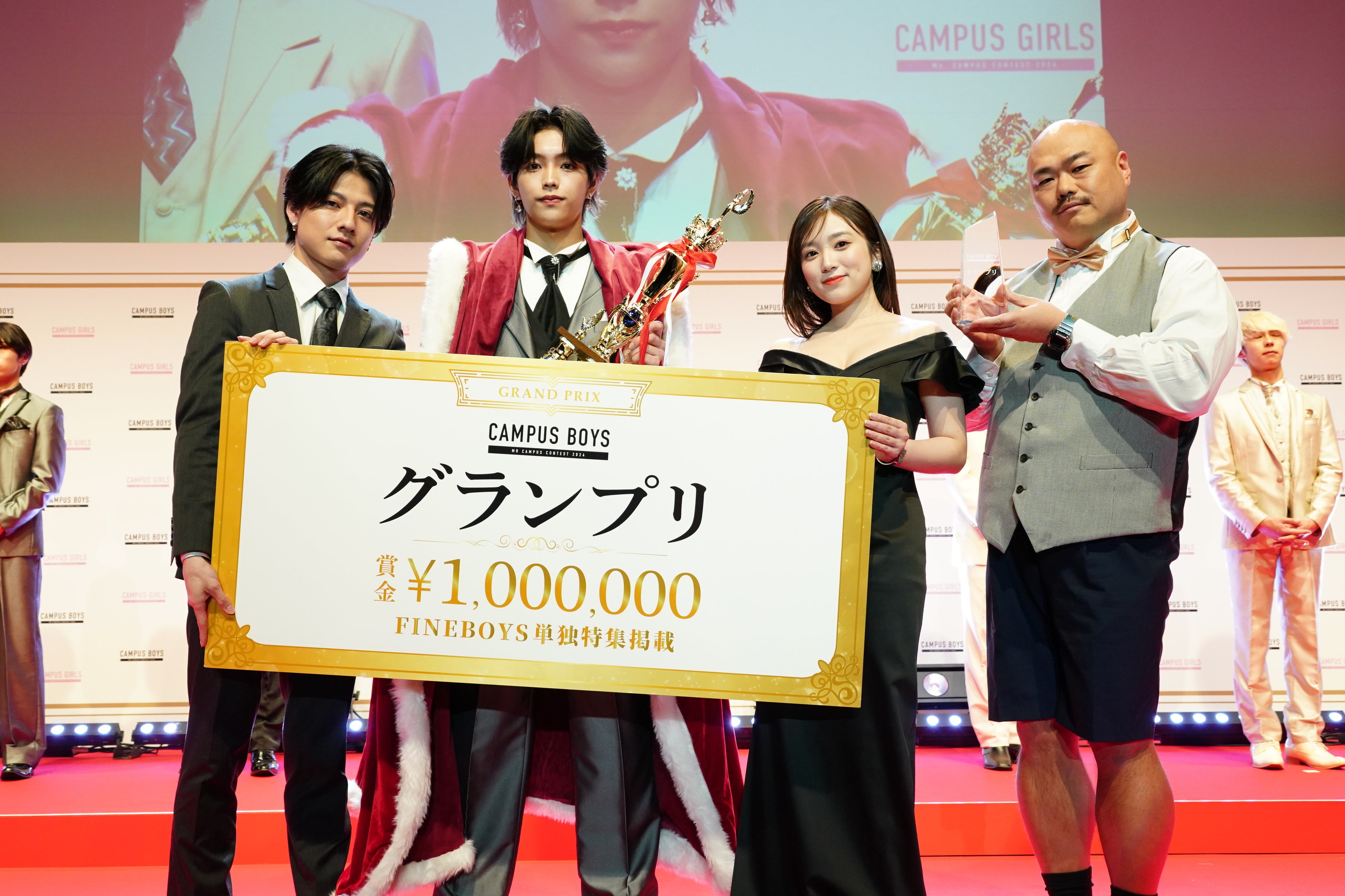 「CAMPUS BOYS 2024」【グランプリ】に田中学人さんが選ばれ、ガウンとトロフィーとクリスタルが授与されました。田中学人さんは【MTRL賞】【ミクチャ賞】にも選ばれ3冠受賞となりました。「辛い時や立ち止まりたい時もたくさんあったけど、グランプリをとれたのは、親をはじめたくさん支えがあったからです。めちゃくちゃ嬉しいです!」と受賞の喜びを語りました。グランプリには、賞金100万円、そして副賞として「FINEBOYS単独特集 見開一面掲載権」が贈られました。