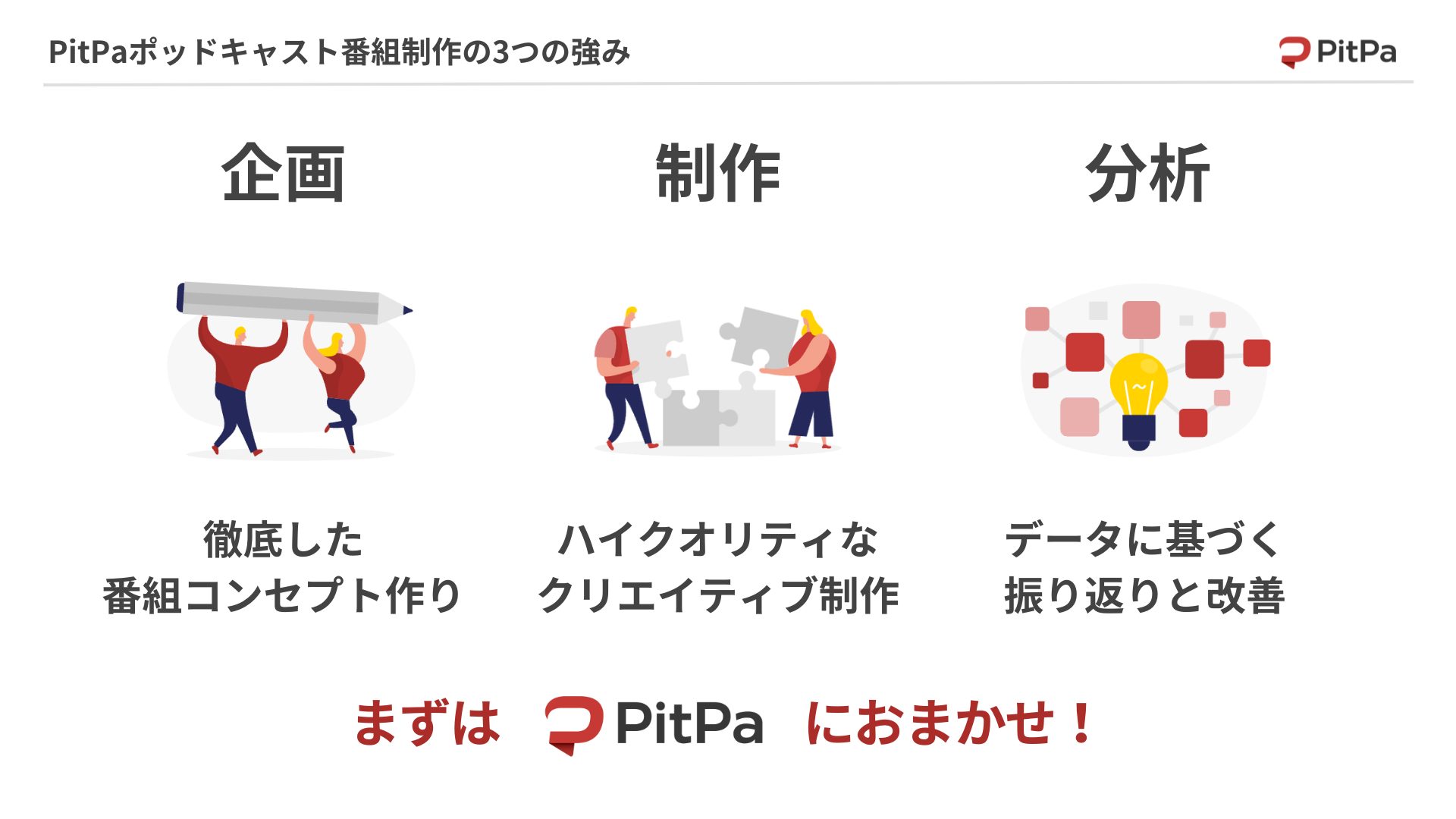 PitPaは、オウンドポッドキャスト制作をサポートする会社です。長年音声コンテンツに携わっているノウハウを活かし、企画から制作、そして分析まで一気通貫でサポートしております。ラジオ局などで活躍してきた音声コンテンツ制作のプロフェッショナルとともに、音声コンテンツの制作・配信およびデータ分析をかけ合わせ、ポッドキャストを活用したビジネス・マーケティング・PRを支援しております。